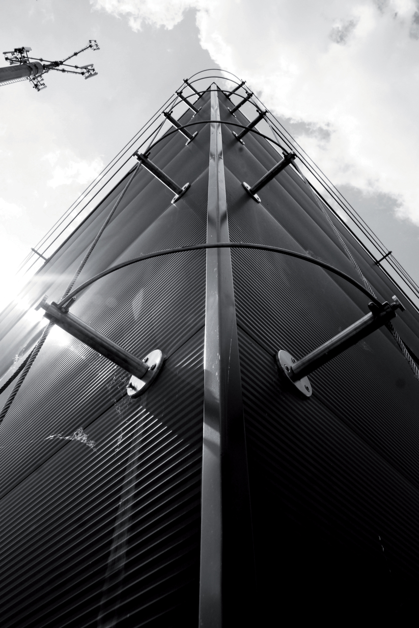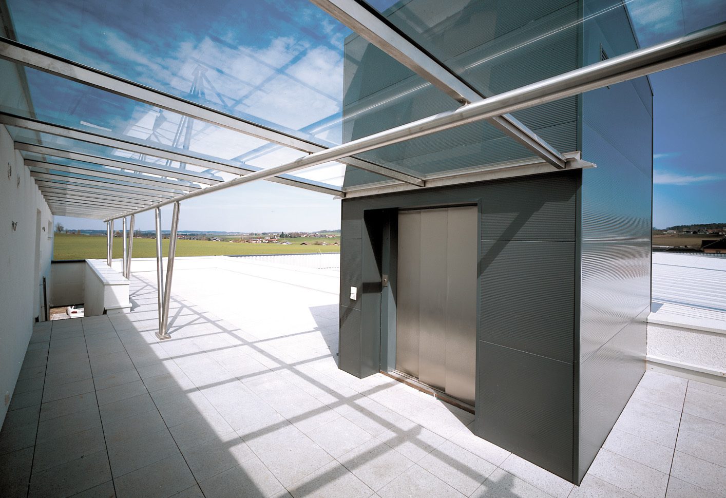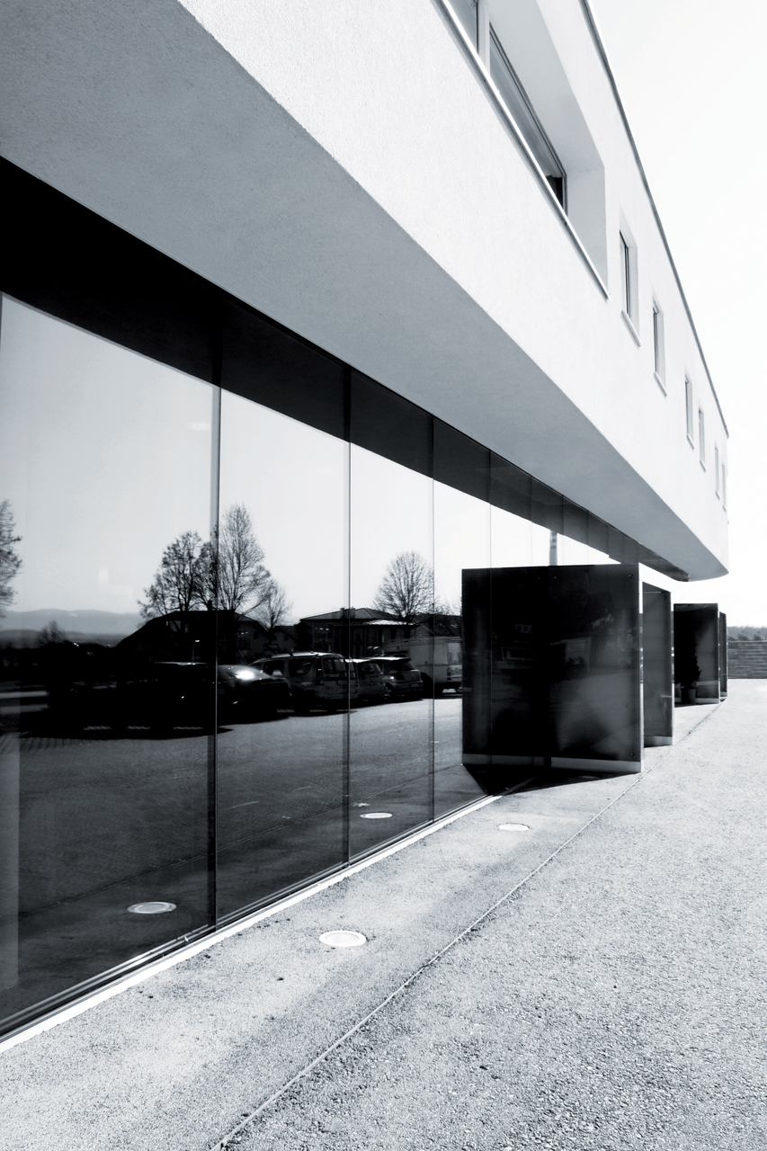Der eingeschossig - angedockte Stahlbau mit anthrazitgrauer Paneeloberfläche verschwindet optisch fast im bestehende Landschaftsbild, wurde aber mit Stahlseilen als - Matrix - umhüllt, um eine gewisse Sensibilität für die Funktionen im Inneren des Gebäudes zu symbolisieren.