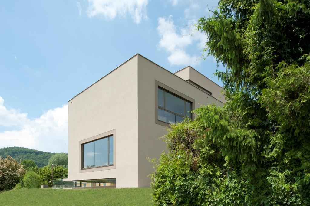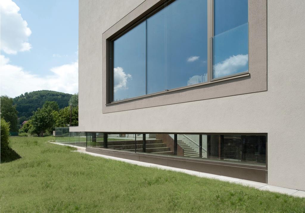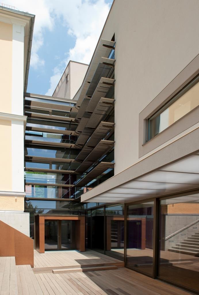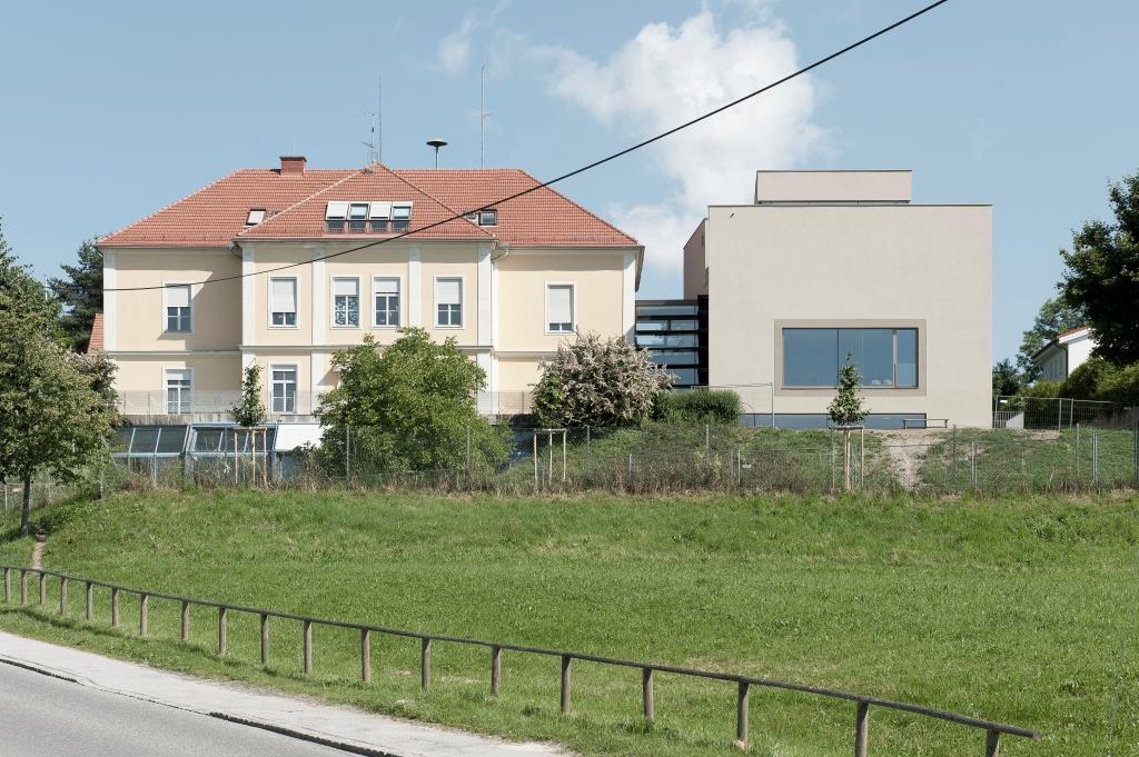 Der viergeschoßige Massivbau wurde hofbildend im rechten Winkel zum Bestand, in das Gelände eingebettet und so an dessen Proportionen angepasst errichtet, wodurch ein sowohl gleichwertiges, als auch harmonisches Pendat zum Altbau geschaffen wurde. Ein Lichtband in Sockelhöhe verleiht der Südfassade des monolithischen Quaders Leichtigkeit. Das bewusst transparent gehaltene Bindeglied markiert den kontrastierten Übergang beider Gebäudeteile, sowie den neuen Knotenpunkt, in dem die Aula untergebracht ist.