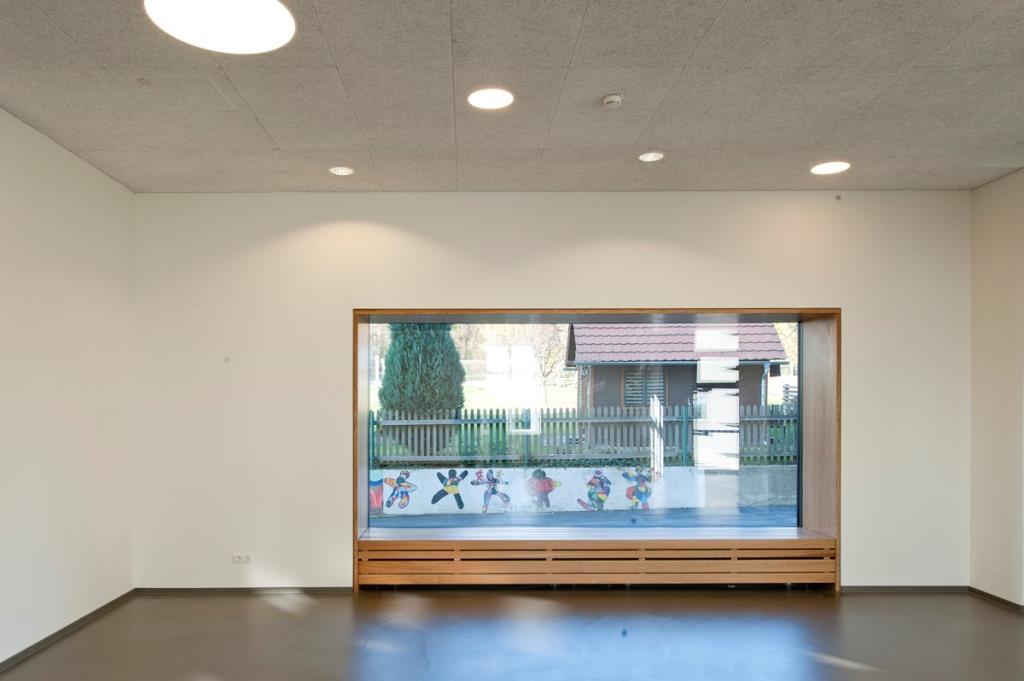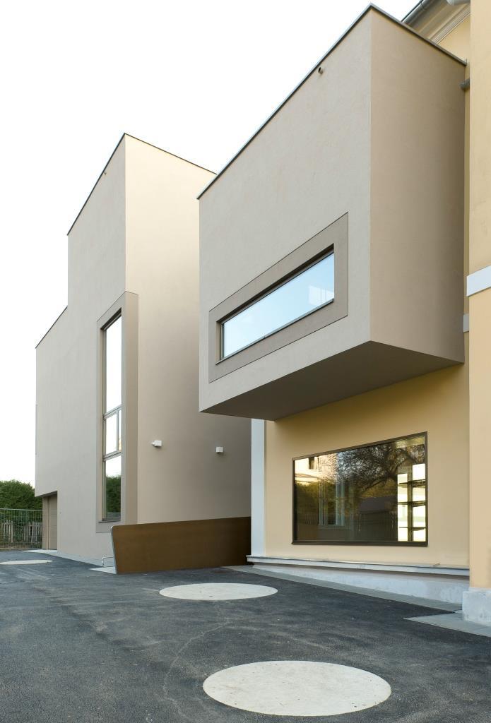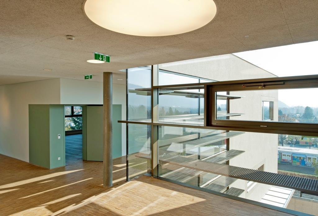 Dieser gemeinschaftliche Ausdruck wird durch gezielt gesetzte, große Bildfenster und durch die vollflächig verglaste Fassadenfront Richtung Pausenhof verstärkt. Die Verbindung von Außen- und Innenraum und die damit entstehenden Blickbeziehungen ermöglichen auch ein selbstständigeres Arbeiten, da die Beaufsichtigung erleichtert wird und sich die Kinder so freier in der Schule bewegen können. Angerampte Niveauunterschiede, sowie die Errichtung einer Aufzuganlage ermöglichen die barrierefreie Erschließung des gesamten Schulgebäudes.