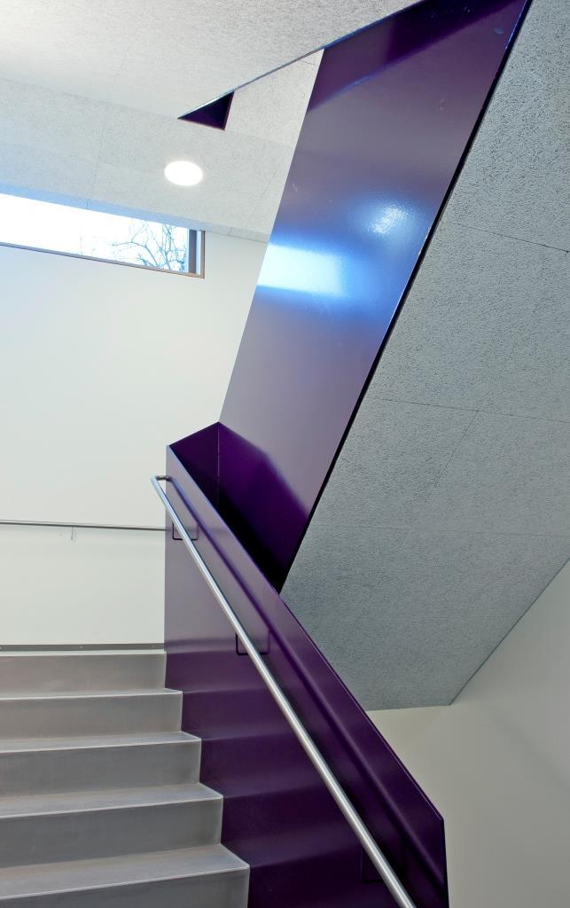 Der offene Grundriss soll ein freies Lernen ermöglichen und Schwellenbereiche werden nur noch durch die unterschiedlich eingesetzten Materialien spürbar. Während in den Unterrichtsräumen Holzböden den Wohlfühlfaktor noch verstärken, wurde in den Aufenthaltszonen vor allem mit funktionellen Bodenbeschichtungen gearbeitet. Diese erzeugen großflächig ein unaufgeregtes und einheitliches Erscheinungsbild und stellen in ihrem Grauton einen sanften Übergang zum bestehenden Terrazzobelag des Altbaus her.