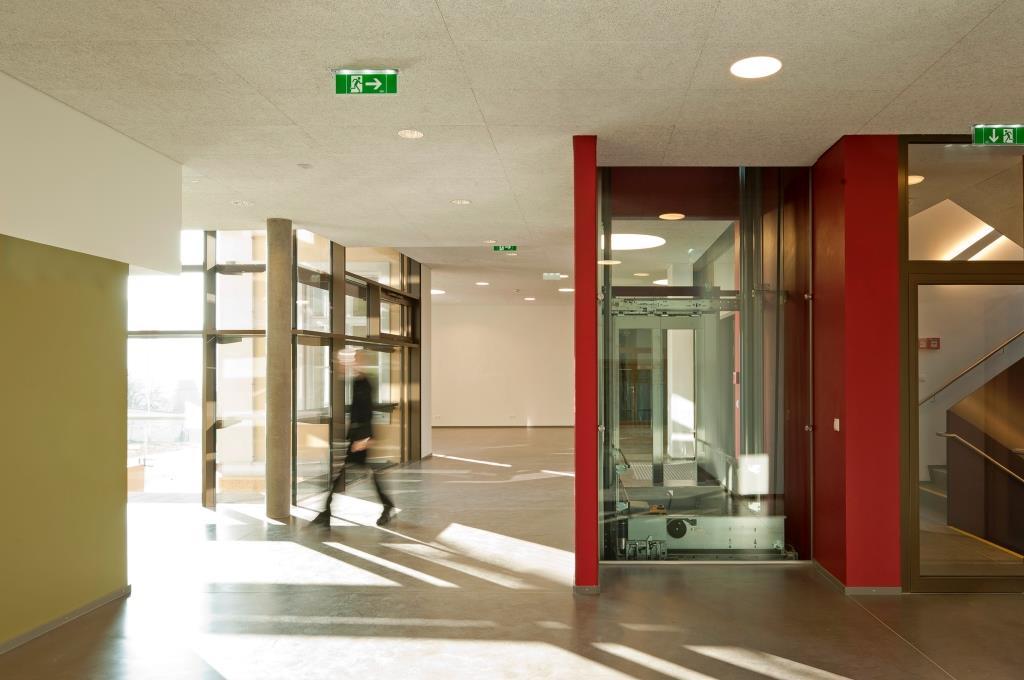 Zudem ist der gesamte Neubau mit einer Fußbodenheizung ausgestattet und gestrichene, abgehängte Holzwollepaneele an den Decken, welche auch im Bestand nachgerüstet wurden, verleihen dem gesamten Komplex eine angenehme Raumakustik. Die Grundrissausbildung und die eingesetzten Materialien gestatten eine nahezu vollständige Bespielung der Flächen, mit dem Ziel, die überholte Funktionstrennung von Klassenraum und Gang aufzulösen und den Leitgedanken einer Schulgemeinschaft zu leben.