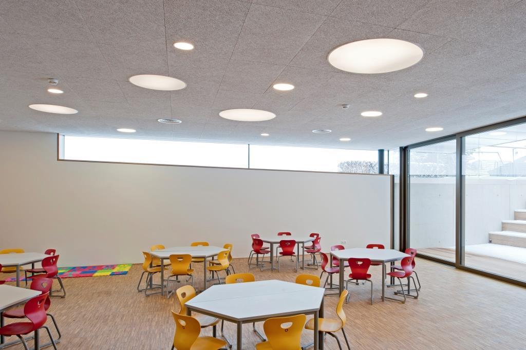 Die komplett verglaste Fassadenfront des neuen Speisesaals lässt sich vollständig öffnen, wodurch bei Veranstaltungen, aber auch im regulären Schulalltag eine Verbindung von Außen- und Innenraum, sowie ein Übergang von geschützter zu offener Fläche geschaffen werden kann. Durch seine zentrale Lage wird dieser Gebäudebereich zusammen mit dem Turnsaal ebenfalls für die Frühaufsicht genutzt, bei der die Kinder schon ab 06:45 Uhr betreut werden können.