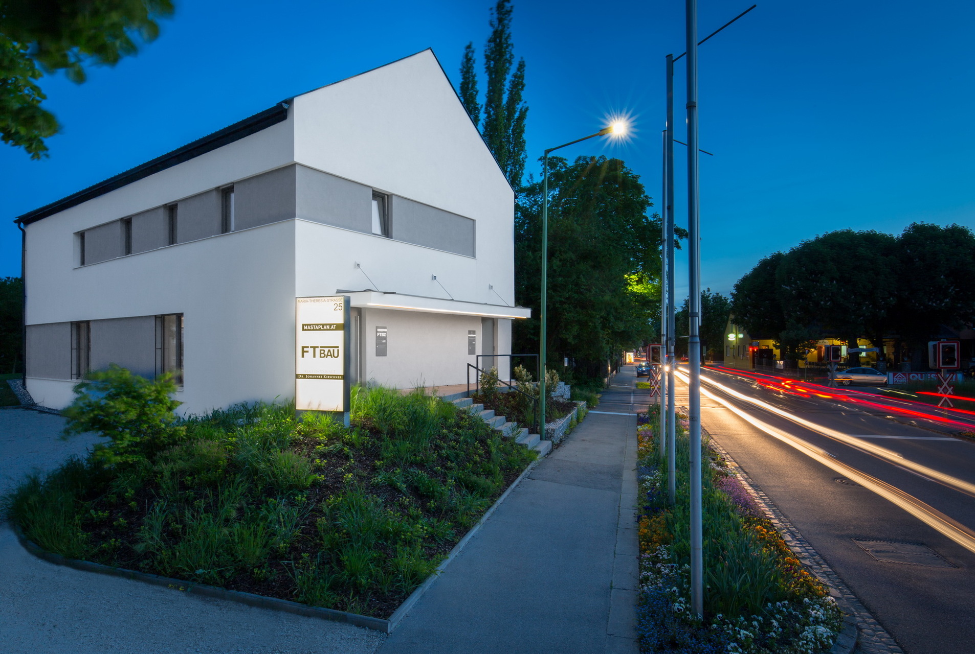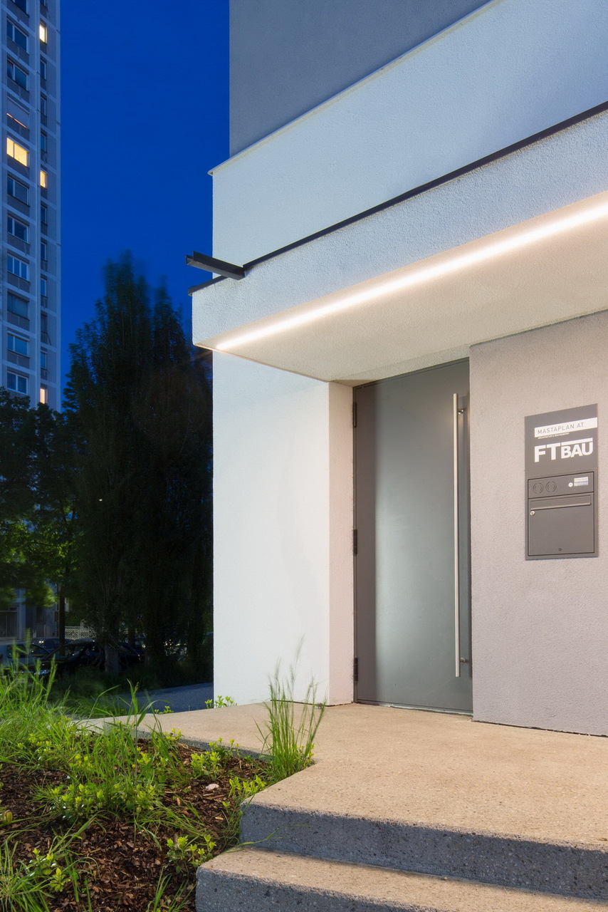 Um die beiden Eingangsbereiche zu den neu entstandenen Büroeinheiten entlang der Straße vor der Witterung zu schützen, wurde ein Vordach angebaut. Der dem Eigengarten zugewandten Seite wurde entsprechend dem Bauherrenwunsch, die Grundrisse so zu gestalten, dass eine Wohn- sowie Büronutzung mögliche sein sollte, ein Balkon vorgesetzt.