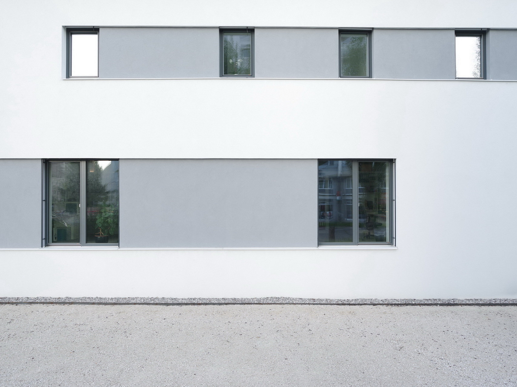 Die unregelmäßig zueinander angeordneten Fensteröffnungen wurden beibehalten und durch eine rückspringende Bänderung, die dem sanierten Gebäude ein markantes Äußeres verleiht, zu einer neuen Linie verbunden.