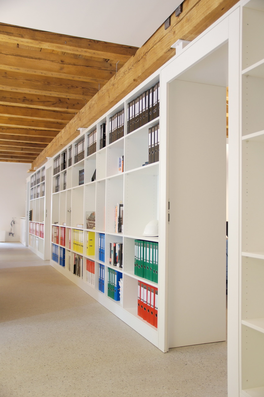 In der Büroeinheit im Obergeschoss, die sich mit ihren Archivräumen auch auf den Dachraum erstreckt, blieb der schon früher sichtbare Teil des Dachstuhls erhalten. Dies, sowie die teilweise bis in den Dachraum geöffneten Räume, geben der gesamten Büroeinheit einen luftigen und leichten Charakter.