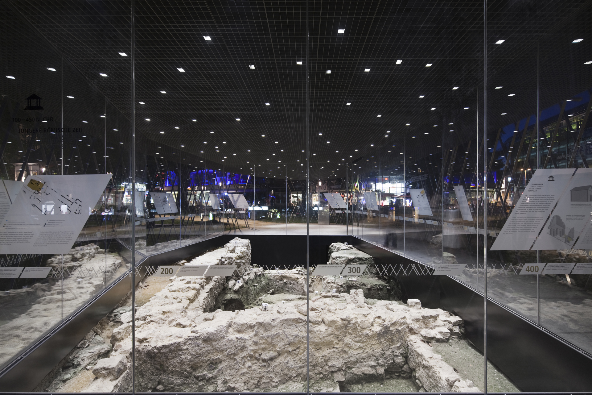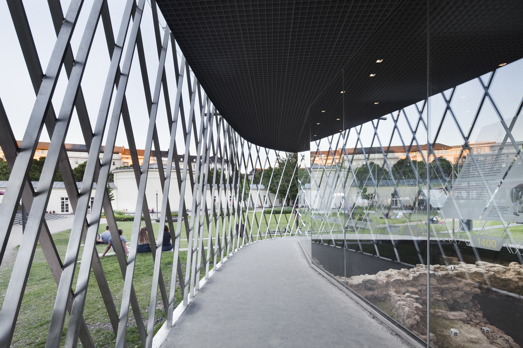 In bewusster Abgrenzung von den im städtischen Kontext üblichen gläsernen Vitrinen umhüllt eine offene Edelstahlkonstruktion den notwendigen klimatischen Raumabschluss. Es entsteht eine spannungsreiche Zwischenzone, die offen zur umgebenden Gartenanlage zum Verweilen und zur Auseinandersetzung mit der Stadtgeschichte einlädt.