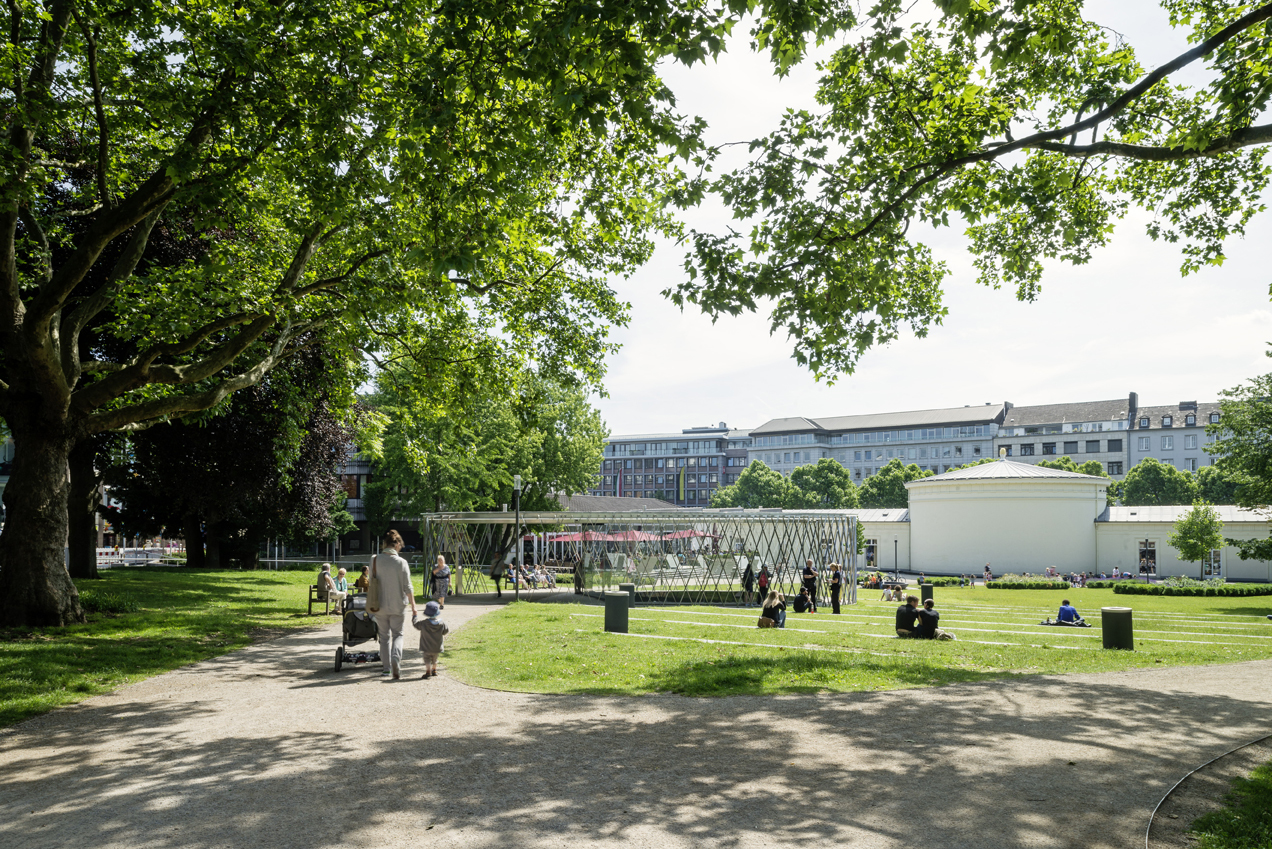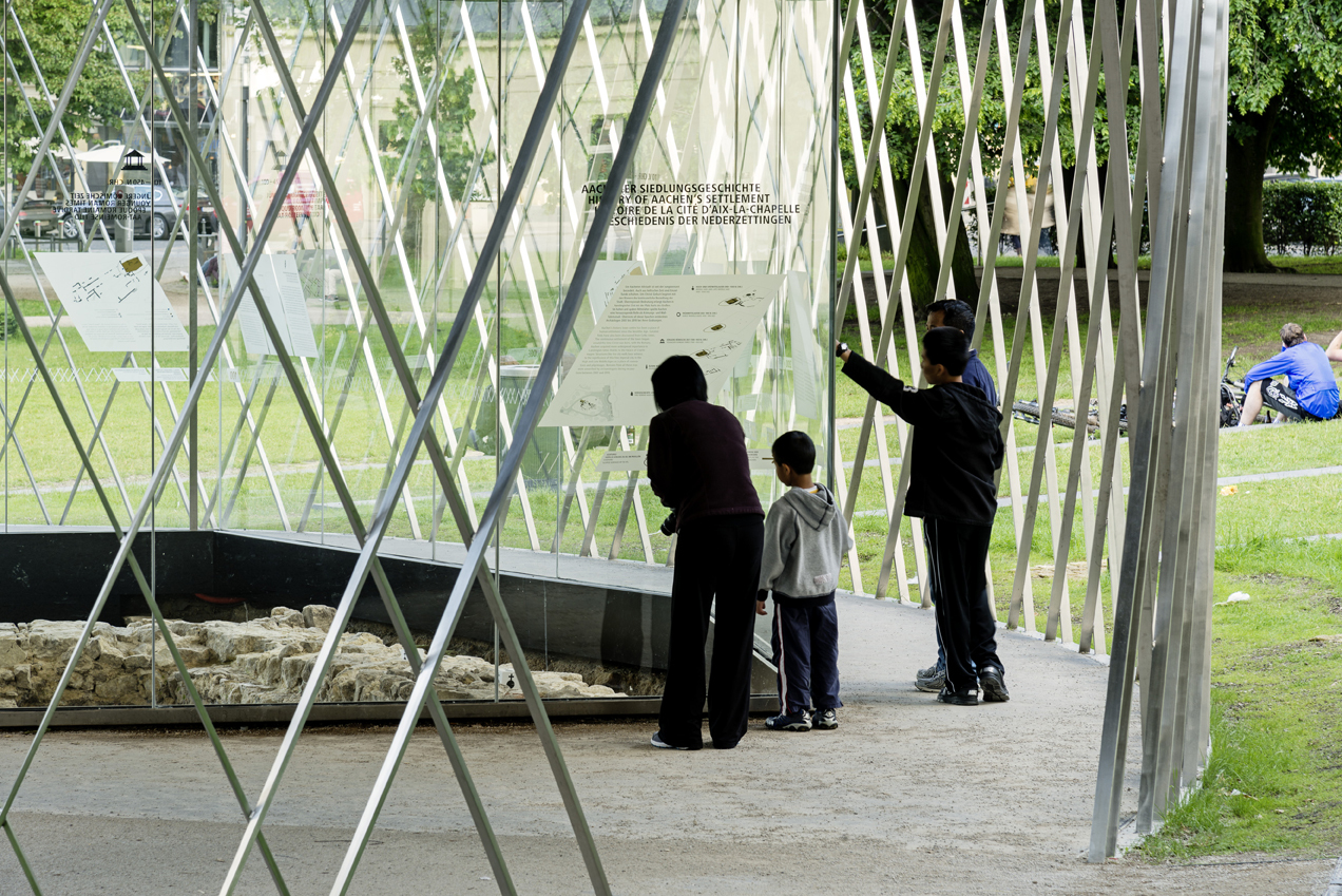 Die äußere Hülle besteht aus zwei Schichten sich diagonal überlagernder Edelstahlprofile. Der Zwischenraum zwischen dieser offenen Hülle und der eigentlichen gläsernen Einhausung der Fundstelle lädt den Besucher ein, vom Weg durch den Park abzuschweifen und so die archäologischen Funde zu erkunden. Die transparente und reduzierte Konstruktion entspricht dabei nicht nur den Erfordernissen des Bauens auf dem Grabungsfeld und den klimatischen Anforderungen der Fundstelle. Sie ermöglicht auch die behutsame Integration des Baukörpers in eine der beliebtesten Parkanlagen Aachens.