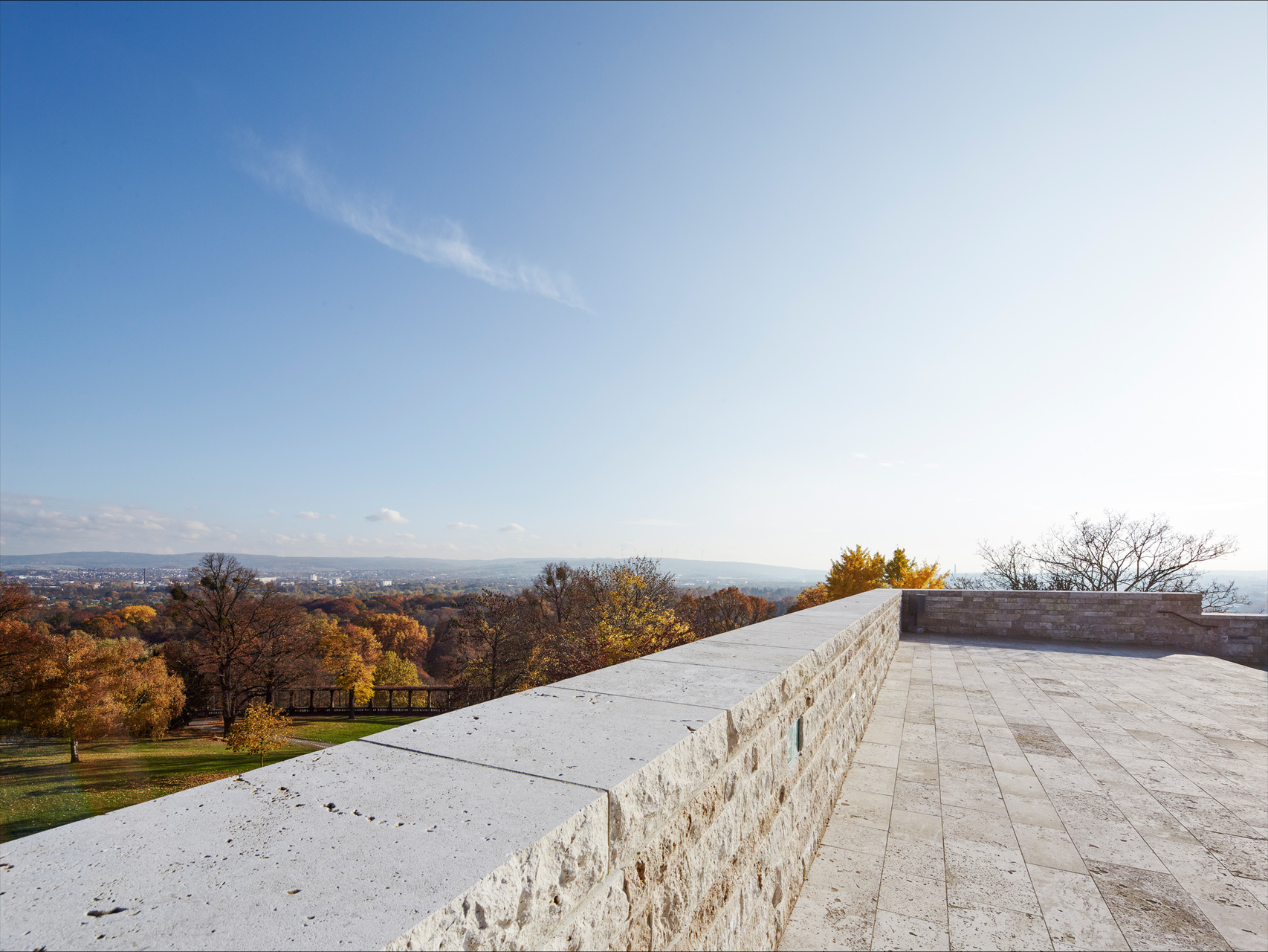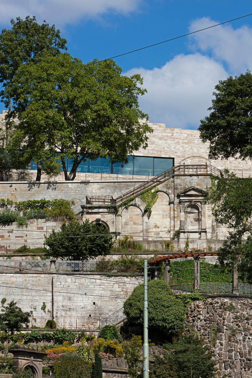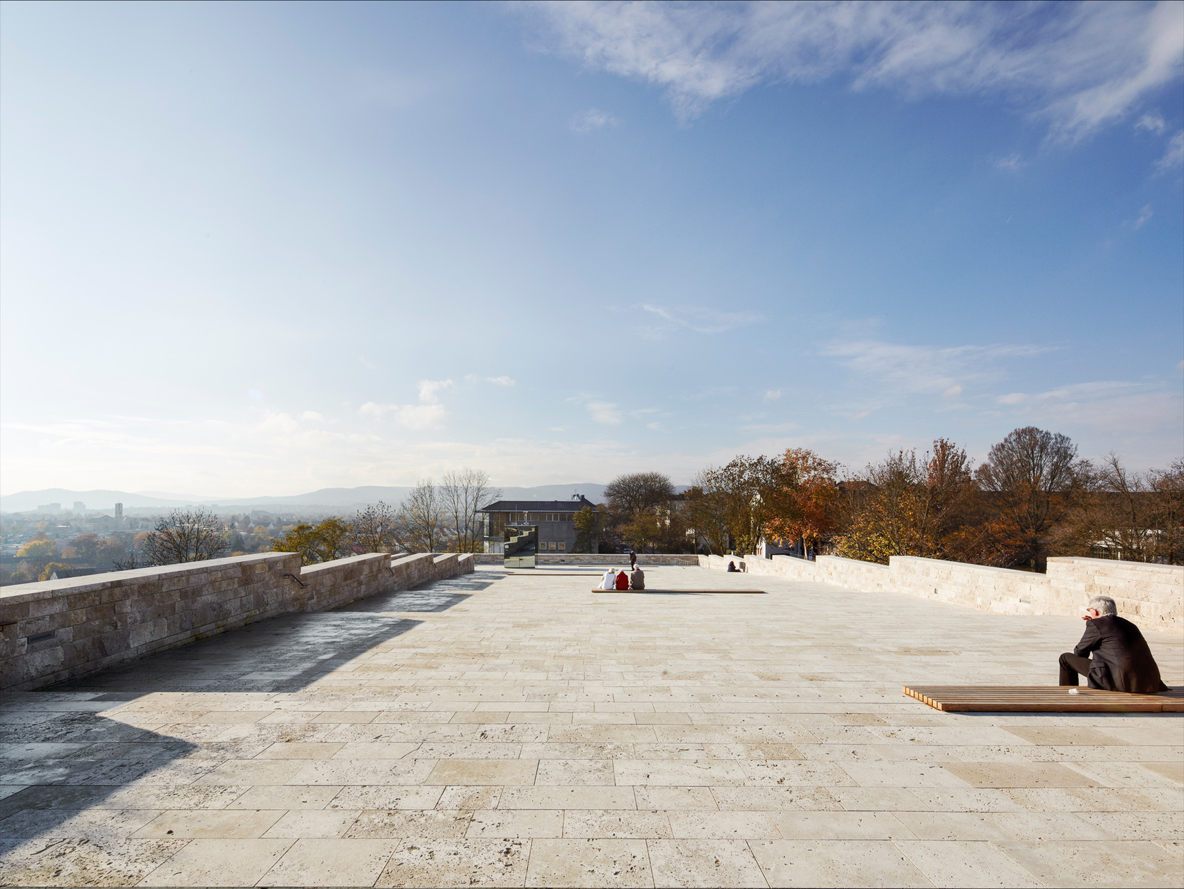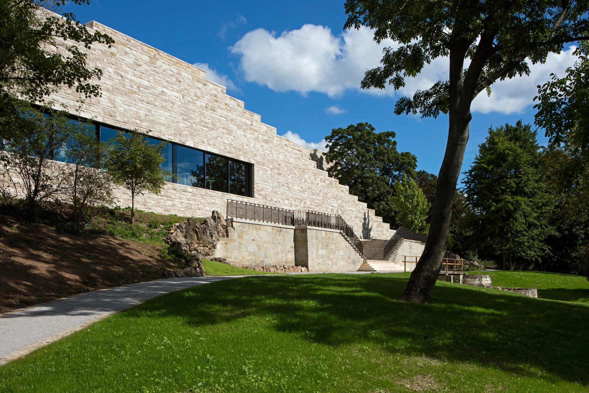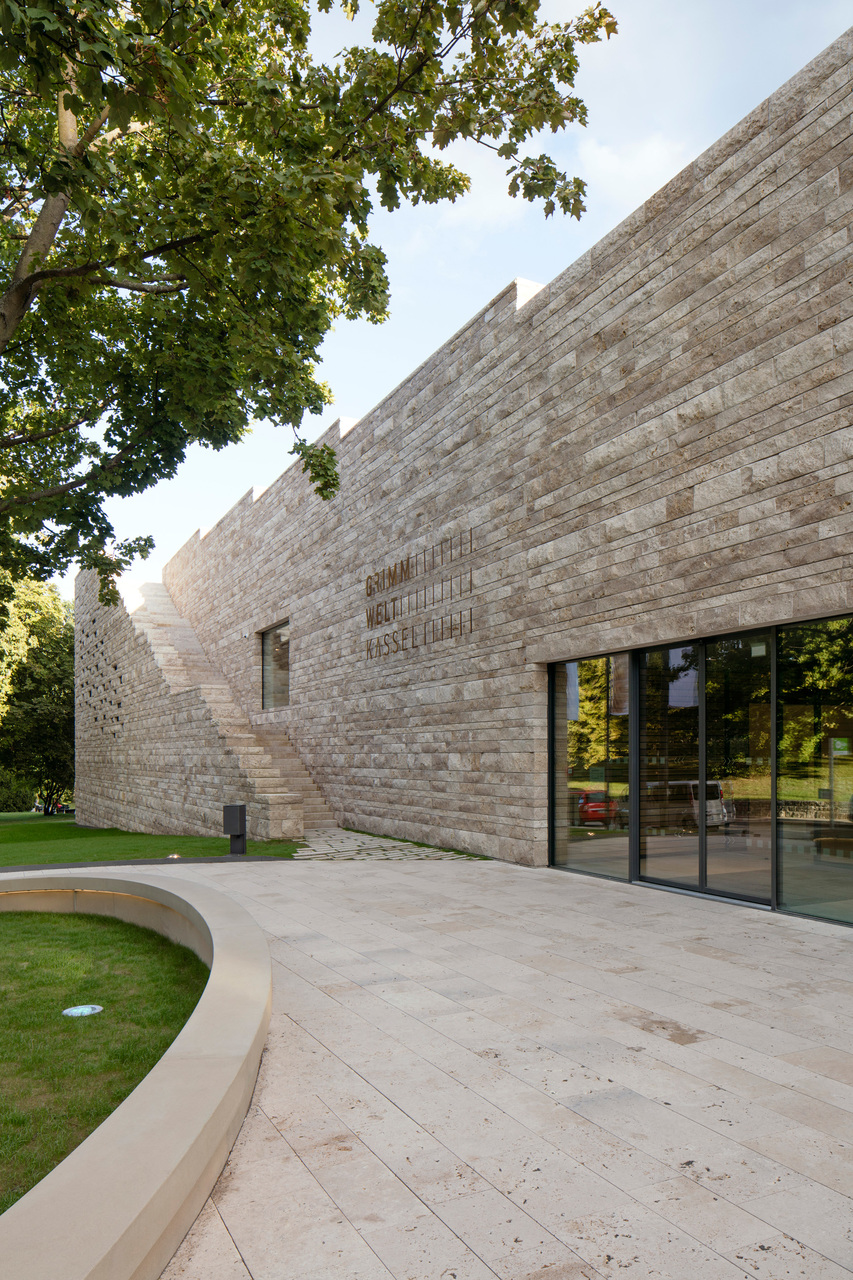 Attraktiv ist indes nicht nur der Inhalt der Grimmwelt. Schon das landschaftliche und architektonische Drumherum lohnt den Besuch. Das vom Aachener Büro kadawittfeldarchitektur entworfene, 2015 fertiggestellte Museumsgebäude steht in einem malerischen Park nahe der Kasseler Innenstadt. Steintreppen, Mauerfragmente und Pergolen prägen die Atmosphäre der Grünanlage am Hang des Weinbergs. Der neue Baukörper verstellt diese Kulisse nicht, sondern bereichert sie.