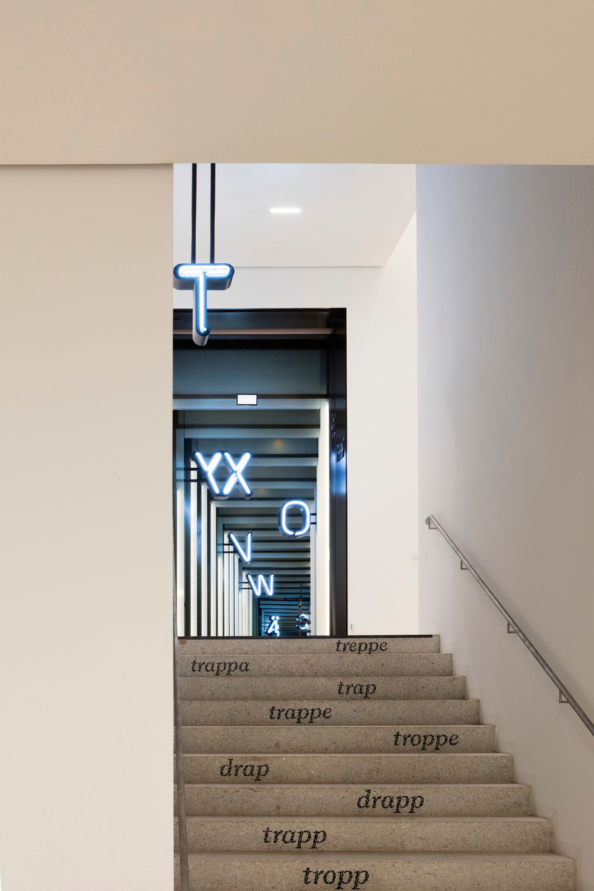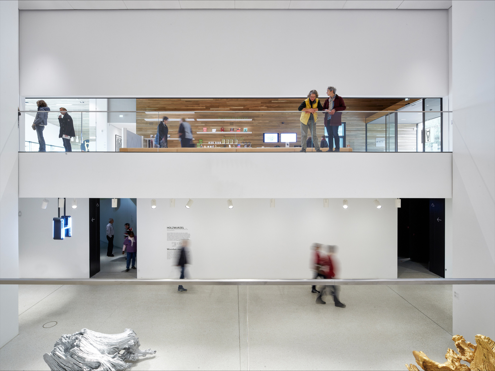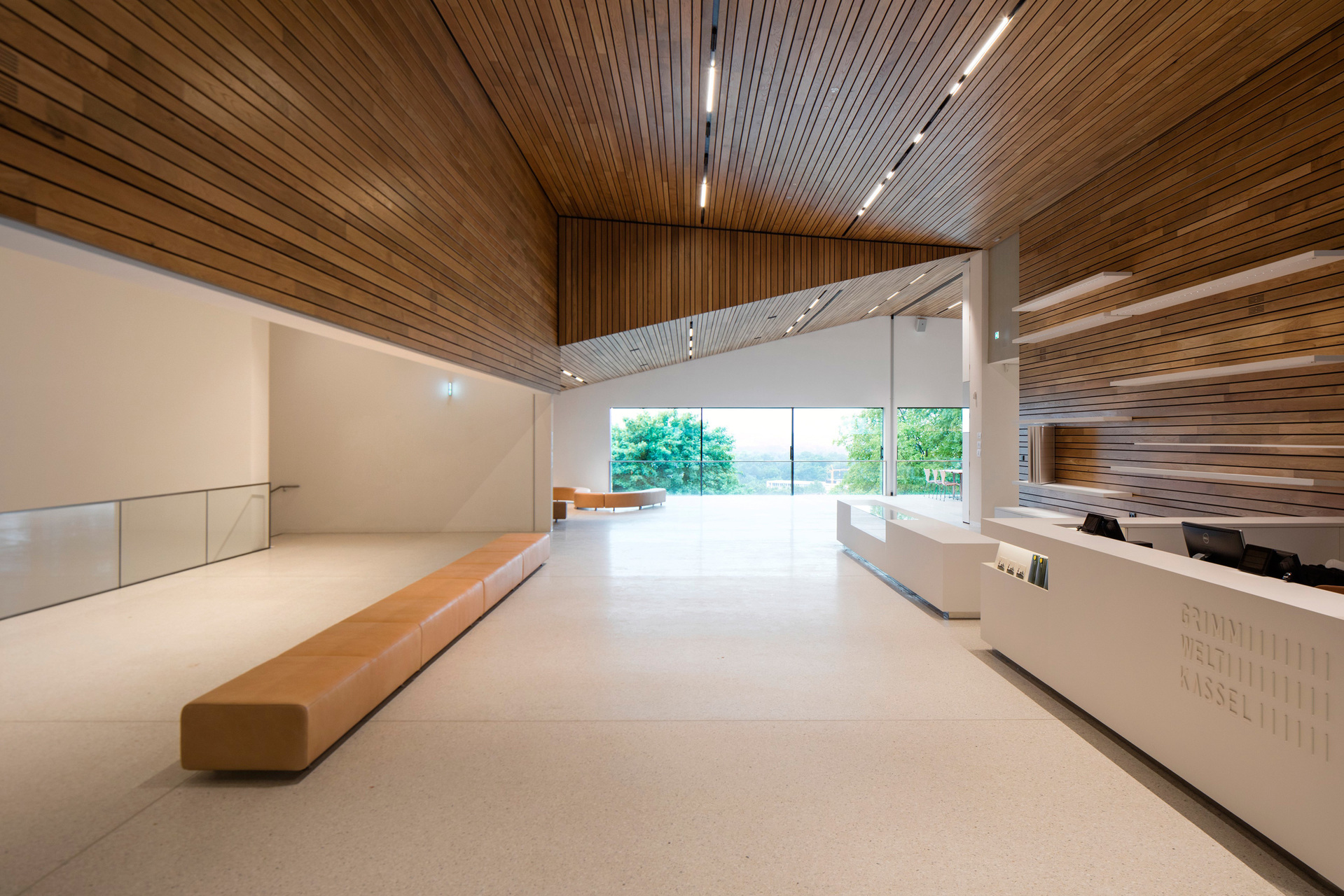 Im Innern erstreckt sich ein zentrales Foyer vom Eingang bis zu einem lichtdurchfluteten Café mit Panoramablick auf die Kasseler Karlsaue. Gegenüber dem offenen Museumsshop in der Mitte des Foyers gewährt eine Galerie Einblick in die tiefer gelegene Split-Level-Ebene. An die Rückwand dieses »Auftraktraums« projizierte Wörter markieren den Übergang in die eigentliche Grimmwelt. Die Galerie war ursprünglich nicht vorgesehen. Man habe »die Lösung gemeinsam mit den Architekten und den Kuratorinnen erarbeitet«, sagt die bei Holzer Kobler für das Projekt verantwortliche Planerin Simone Haar. Auch anderenorts wurden Raumstrukturen an die Wünsche der Ausstellungsgestalter angepasst. Beispielsweise entstanden statt der geplanten Ausstellungskabinette Großräume mit eigens entwickelter Binnengliederung.