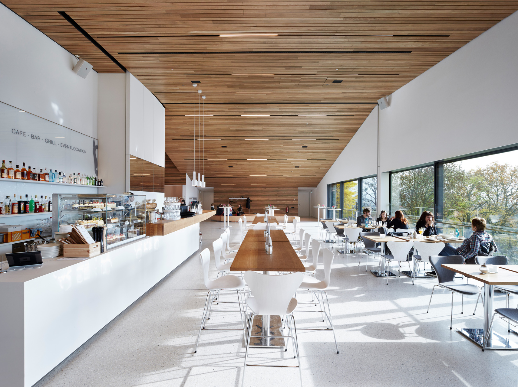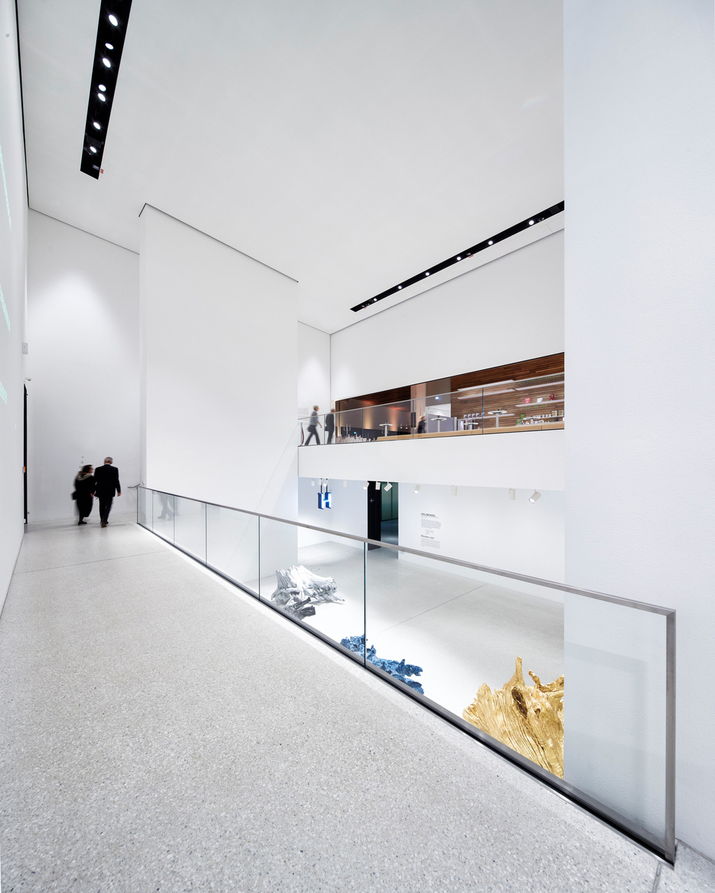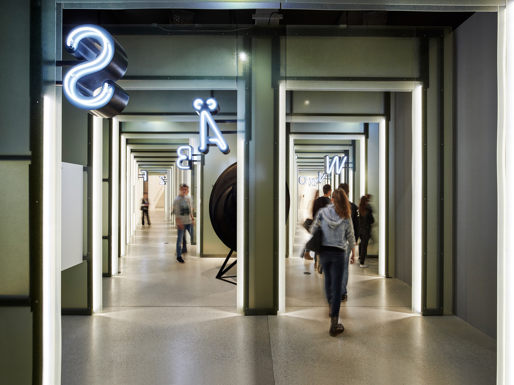 Im Innern erstreckt sich ein zentrales Foyer vom Eingang bis zu einem lichtdurchfluteten Café mit Panoramablick auf die Kasseler Karlsaue. Gegenüber dem offenen Museumsshop in der Mitte des Foyers gewährt eine Galerie Einblick in die tiefer gelegene Split-Level-Ebene. An die Rückwand dieses »Auftraktraums« projizierte Wörter markieren den Übergang in die eigentliche Grimmwelt. Die Galerie war ursprünglich nicht vorgesehen. Man habe »die Lösung gemeinsam mit den Architekten und den Kuratorinnen erarbeitet«, sagt die bei Holzer Kobler für das Projekt verantwortliche Planerin Simone Haar. Auch anderenorts wurden Raumstrukturen an die Wünsche der Ausstellungsgestalter angepasst. Beispielsweise entstanden statt der geplanten Ausstellungskabinette Großräume mit eigens entwickelter Binnengliederung.