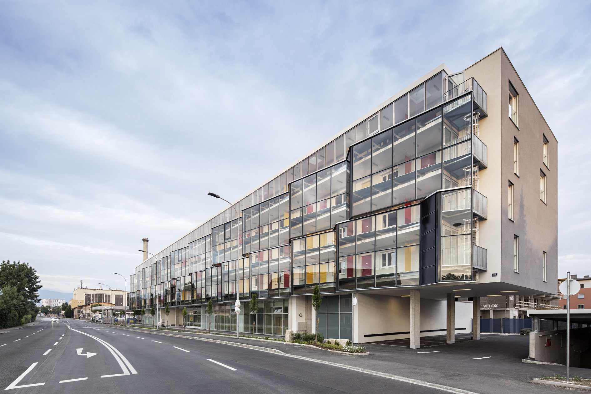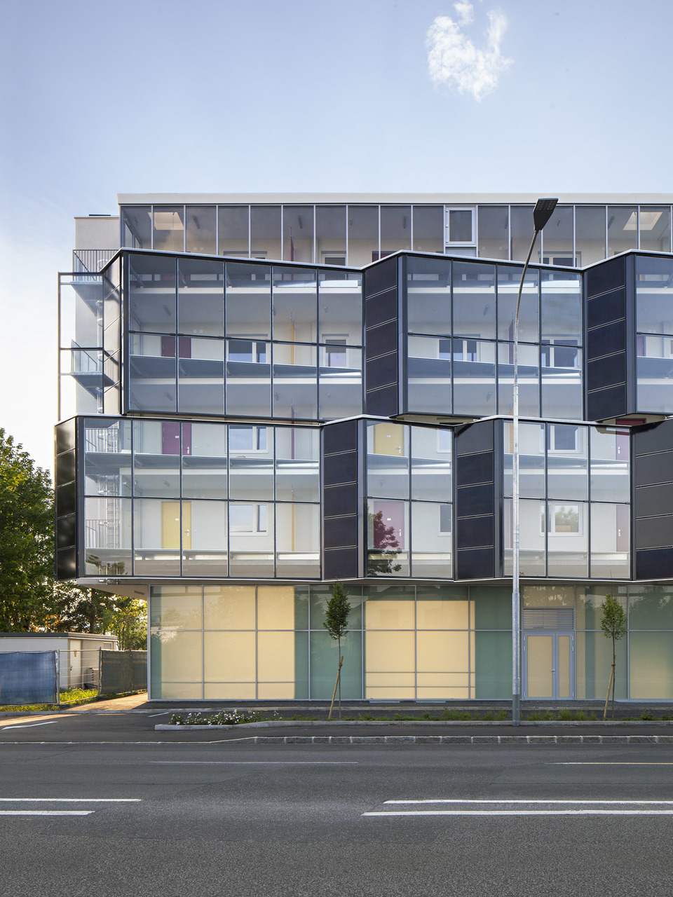 Der lang-gestreckte Baukörper mit den 53 Wohnungen schwebt auf dem verglasten Erdgeschoss das ausschließlich gemeinschaftliche Bereiche wie ein Café, einen Kinderwagen- und Fahrradabstellplatz, den Generationstreff mit Gemeinschaftsräumen beinhaltet. Gleichzeitig trennt diese Sockelzone den begrünten Innenhof mit Kinderspielplatz von der Pischeldorfer Straße wo auch die Zufahrt in die Parkgarage im Untergeschoß liegt. Von der Straße bzw. der Garage aus sind die vier Wohngeschosse über zwei großzügige verglaste Stiegenhäuser erschlossen die in den Laubengang führen.