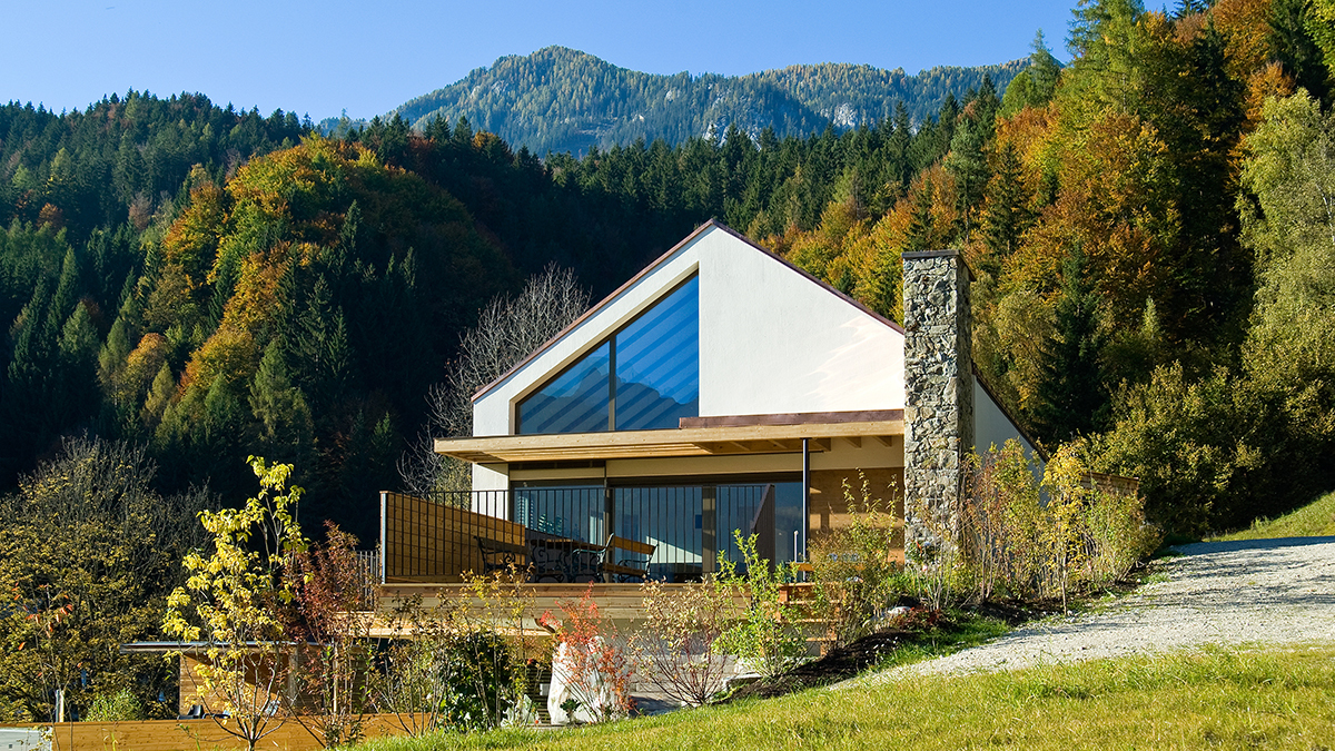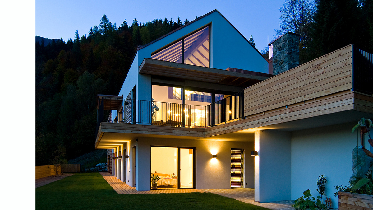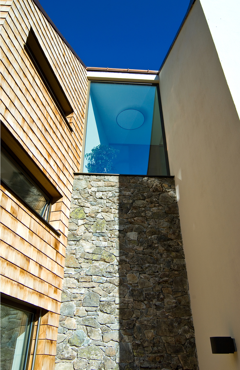 Ein transparent gehaltenes Treppenhaus gliedert die Fassade des langgezogenen Gebäudes in zwei Baukörper, die sich sowohl in ihrer Funktion, als auch in der gestalterischen Ausformulierung voneinander abgrenzen. Nebenräume, Garage und Wellnessbereich sind im leicht schräg zum restlichen Komplex ausgerichteten, nördlichen Teil untergebracht, der mit Holzschindeln verkleidet ist. Der Hauptwohnbereich ist weiß verputzt und greift an der Fassade selektiv regionale Werkstoffe wie Findlingssteine, Kupfer und Rundhölzer auf.