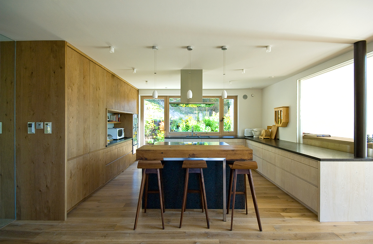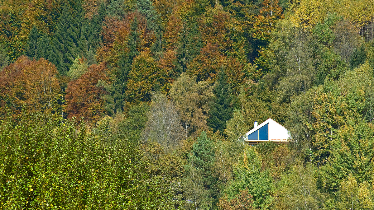 Von Nordosten durch Hang und Wald geschützt, öffnet sich das Haus nach Südwesten hin mit Ausblick auf den Hauser Kaibling und dem darunter liegenden Tal. Der Grundriss ist in seiner Raumaufteilung den vorhandenen Belichtungsmöglichkeiten angepasst, wodurch Aufenthalts- und Wohnzonen an der großzügig verglasten Fassade situiert sind, während Neben- und Sanitärräume in den Hang eingebaut wurden.