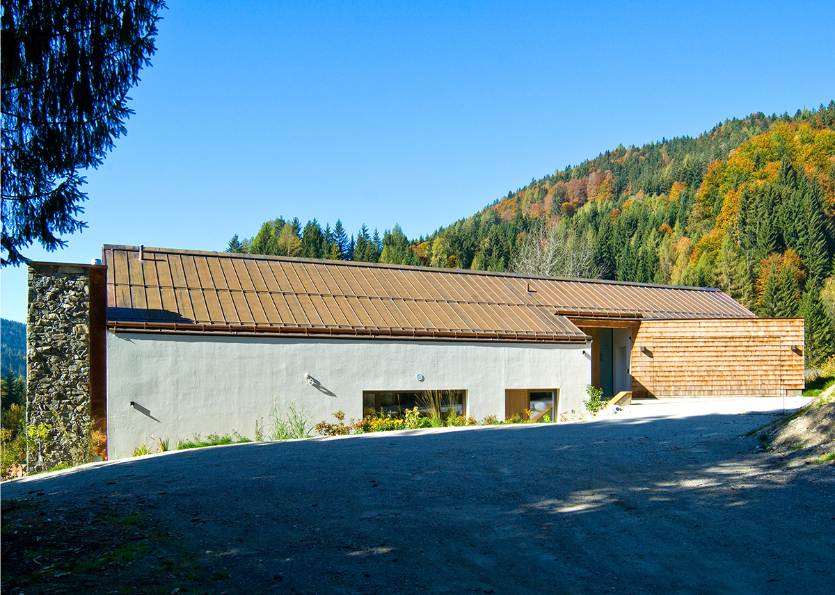 Die Mischkonstruktion aus Holzriegel-, Stahlbeton- und Ziegelbauweise ist als länglicher, schmaler Baukörper parallel zum Hang orientiert und in das Gelände eingeschoben. Das Konzept des Baus basiert auf den Gegensätzen ein großzügiges Raumgefüge zu schaffen, dabei aber der umgebenden Landschaft so wenig Raum wie möglich zu nehmen. Zudem wurde eine zeitgemäße Architektursprache angestrebt, welche traditionelle Bauweisen und regionale Materialien vereinzelt aufgreift. Resultat war ein Giebelbau ohne Dachüberstand mit einem an der Längsseite offenen und verglasten Dachraum, welcher durch eine Galerieausbildung zusätzlich Raum schafft und sich in seiner Kubatur an den Baukörpern der Umgebung orientiert. Ein Geländeunterschied am Grundstück von etwa zehn Metern prägte den Entwurf überdies dahingehend, dass die 463 m² Nutzfläche auf drei Geschoße terrassenartig aufgeteilt wurde.