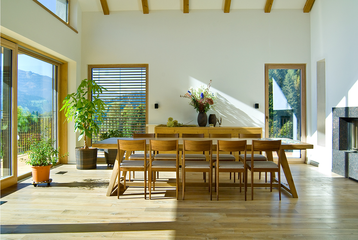 Im Inneren verstärken schlichte Materialien wie Eichenparkett und weiß verputzte Wände das klare Konzept des offenen Grundrisses und schaffen durch die warmen Erdtöne ein harmonisches Erscheinungsbild. (Text: Marlene Bartelme)