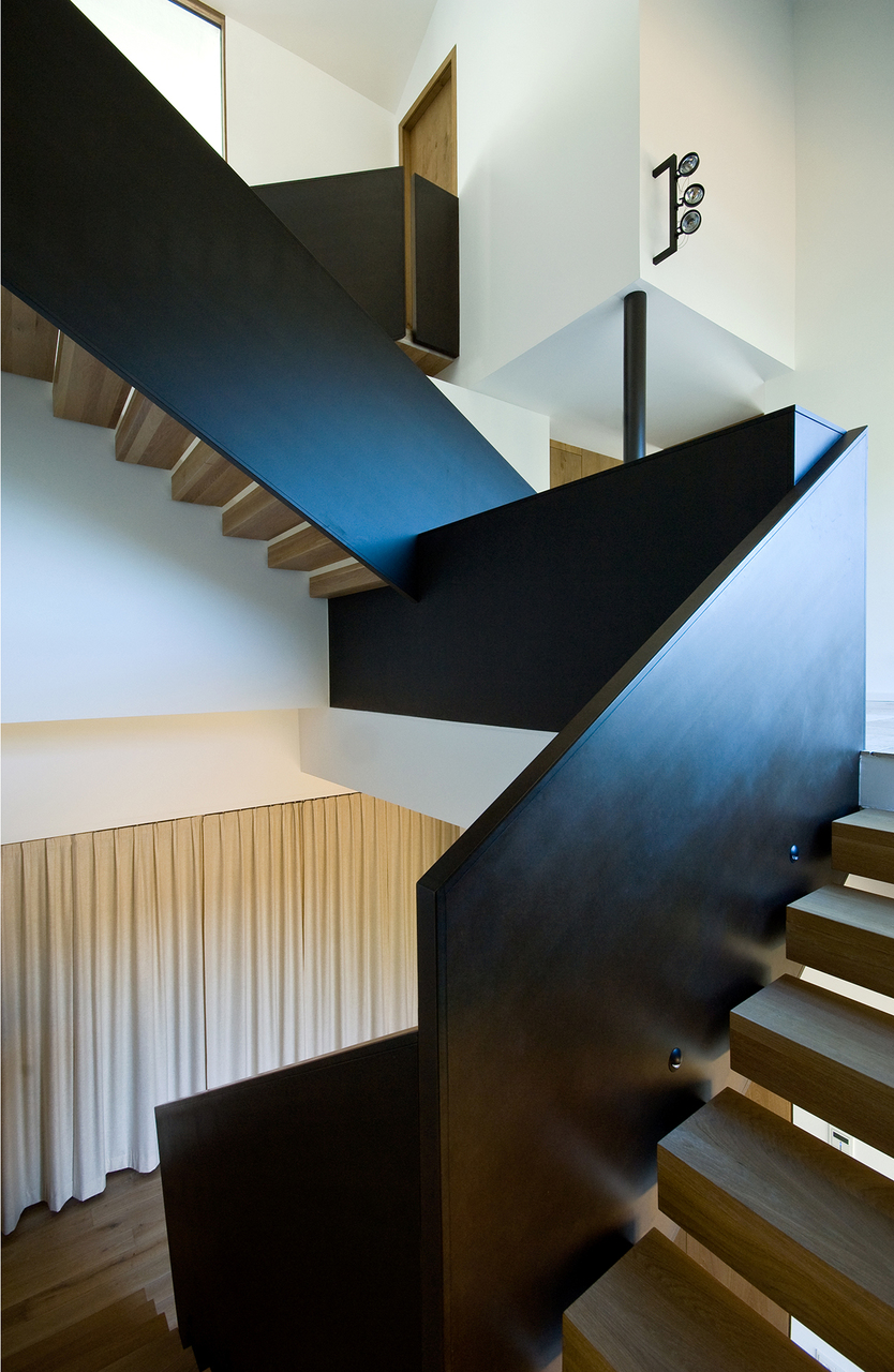 Fährt man von Osten zum Gebäude zu, ist lediglich die oberste Etage mit Eingangsbereich, Büro und Garage ersichtlich. Auf der mittleren Ebene sind sämtliche Aufenthaltszonen untergebracht. Wohnzimmer und Kochbereich gehen offen ineinander über und sind durch umlaufende Terrassen nach außen erweiterbar. Die vorgelagerten Terrassenkonstruktionen schaffen außerdem großzügige, überdachte Freibereiche im darunter liegenden Gartengeschoß und dienen, zusammen mit weiteren Holzauskragungen in den oberen Ebenen, als Sonnenschutz.