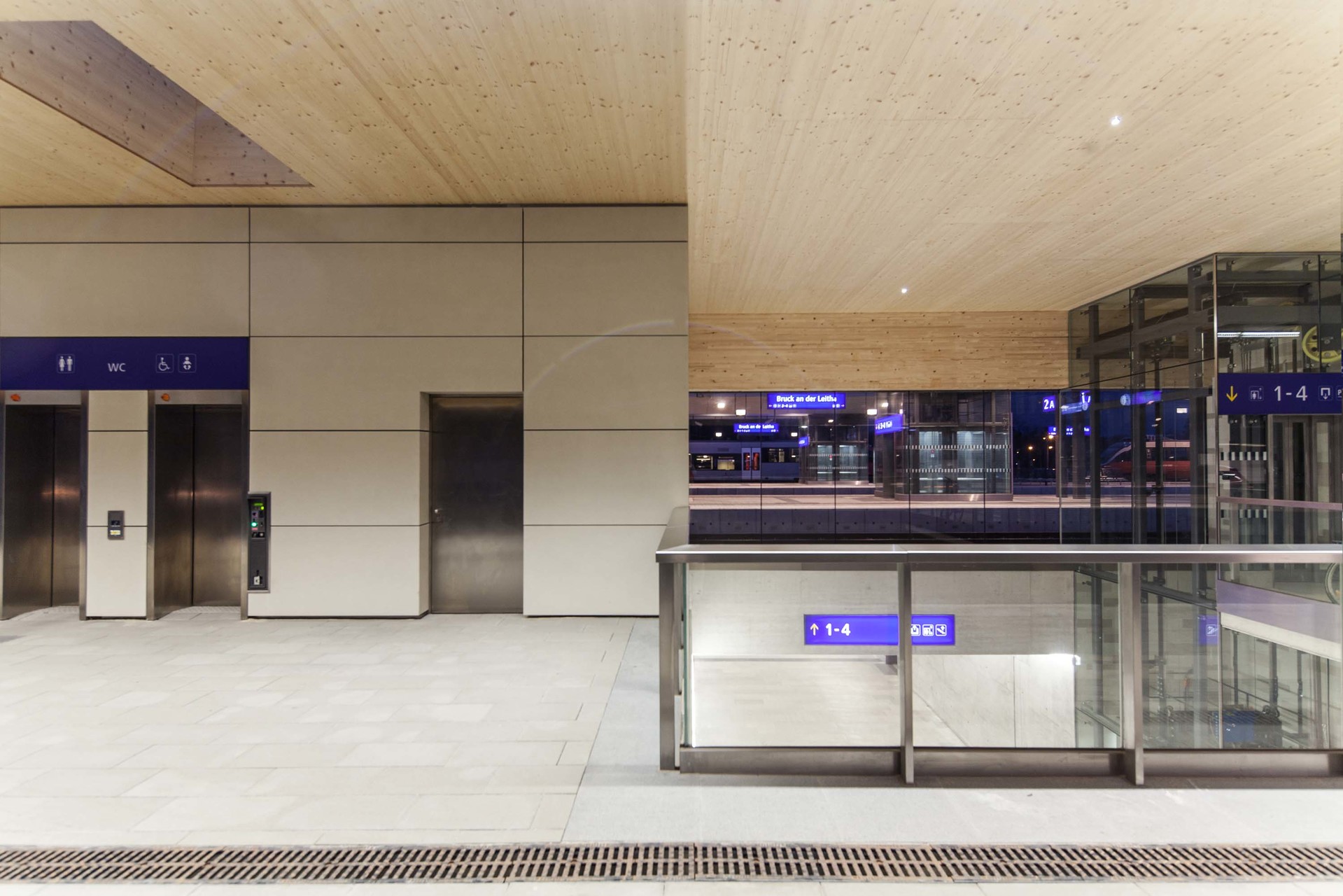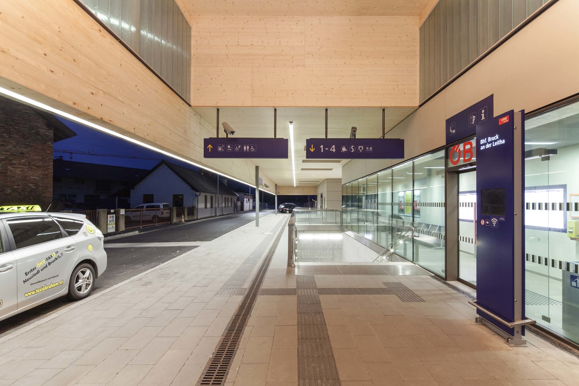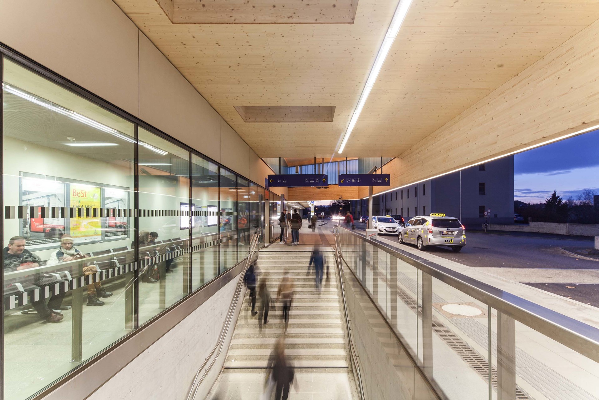 Neubau einer Mobilitätsdrehscheibe. Umsteigen vom Fahrrad, Bus, Auto und Zug unter einem Dach. Das Aufnahmegebäude signalisiert Offenheit und Transparenz, die Materialien und Oberflächen sind hell und wertig. Unter dem Holzdach entsteht ein wettergeschützter Vorplatz als Schnittstelle zum Busbahnhof und den Fahrrad- und Motorradabstellplätzen sowie der Kiss und Ride Anlage. Die Einfachheit und Schlichtheit der Holzdachkonstruktion gebildet aus Brettsperrholzplatten welche punktuell auf zarten Stahlstützen auflagern und auf dem linienförmig auf einem Stahlbetonrückrat aufliegen zeichnen das Bauwerk aus. Hervorzuheben ist die präzise Verarbeitung der Detailausbildung. Die Kombination der Materialien von Holz und Beton ist hier vorbildlich demonstriert und zeigt den berechtigten Einsatz von Holz bei Infrastrukturprojekte. (Text: Jurytext Holzbaupreis Niederösterreich 2016)