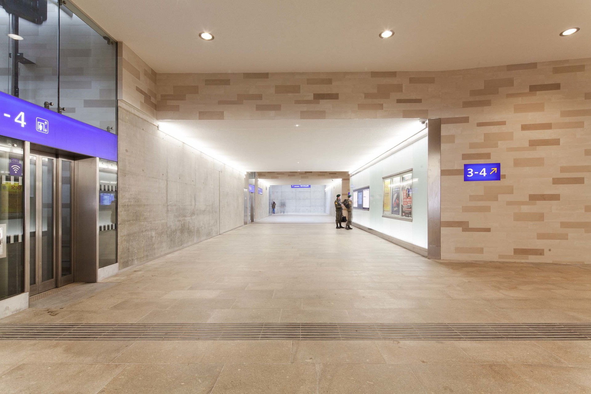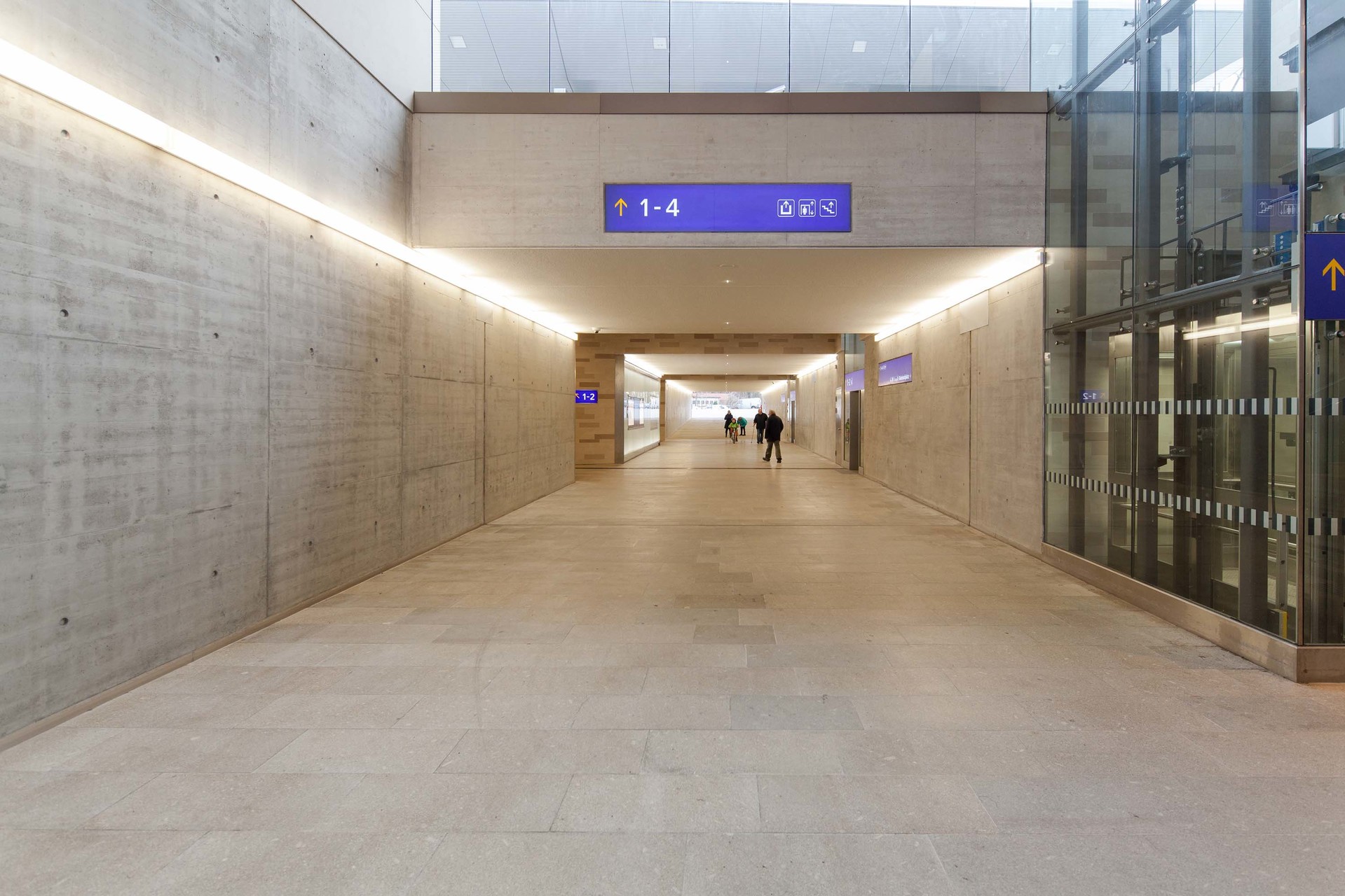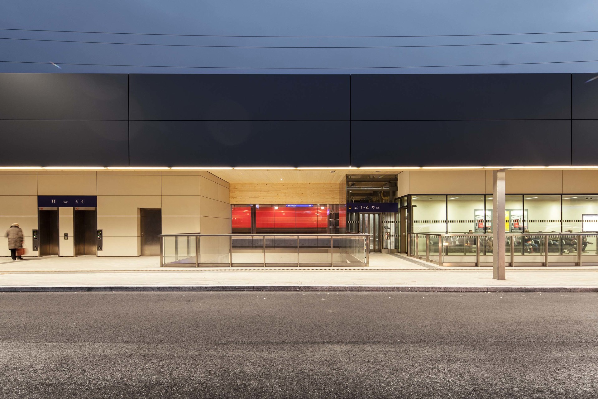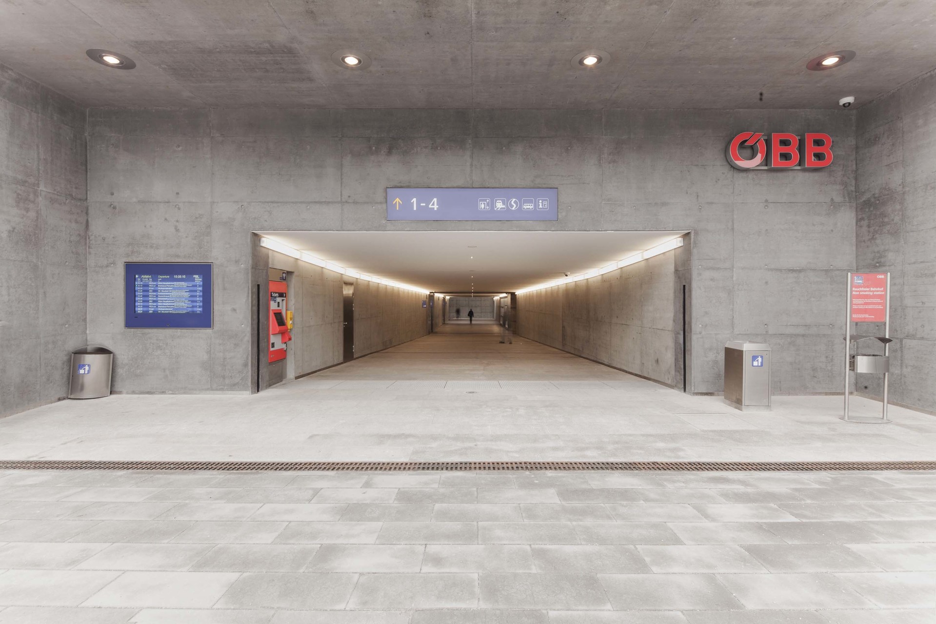 Neubau einer Mobilitätsdrehscheibe. Umsteigen vom Fahrrad, Bus, Auto und Zug unter einem Dach. Das Aufnahmegebäude signalisiert Offenheit und Transparenz, die Materialien und Oberflächen sind hell und wertig. Unter dem Holzdach entsteht ein wettergeschützter Vorplatz als Schnittstelle zum Busbahnhof und den Fahrrad- und Motorradabstellplätzen sowie der Kiss und Ride Anlage. Die Einfachheit und Schlichtheit der Holzdachkonstruktion gebildet aus Brettsperrholzplatten welche punktuell auf zarten Stahlstützen auflagern und auf dem linienförmig auf einem Stahlbetonrückrat aufliegen zeichnen das Bauwerk aus. Hervorzuheben ist die präzise Verarbeitung der Detailausbildung. Die Kombination der Materialien von Holz und Beton ist hier vorbildlich demonstriert und zeigt den berechtigten Einsatz von Holz bei Infrastrukturprojekte. (Text: Jurytext Holzbaupreis Niederösterreich 2016)