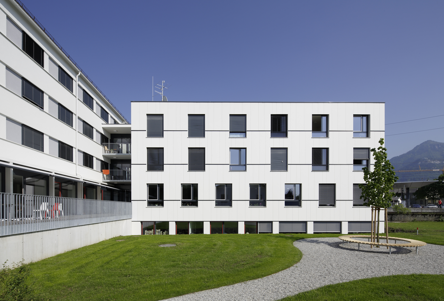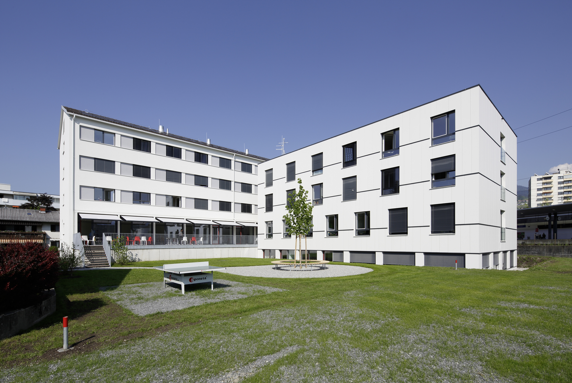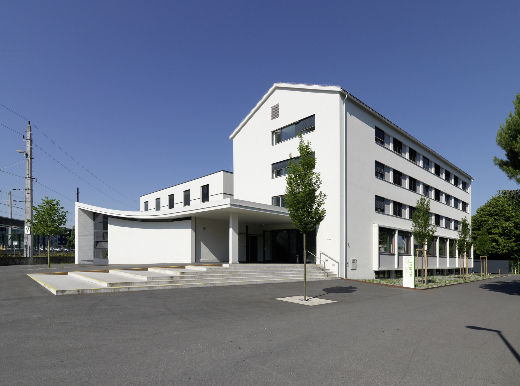 Die Arbeitsgemeinschaft der Architekten Hörburger und Kuëss aus Bregenz sanierte daraufhin den Altbau und ergänzte die Anlage um einen neuen Wohntrakt, der mit einem schmalen Verbindungselement im rechten Winkel an das Haupthaus anschließt. So entstand im Südwesten ein geschützter Gartenhof. Die stadtseitige Fassade hingegen erlangte durch Abriss eines Bestandsgebäudes mehr Präsenz, öffnet sich mit Freitreppe und Vorplatz Richtung Bahnhof.