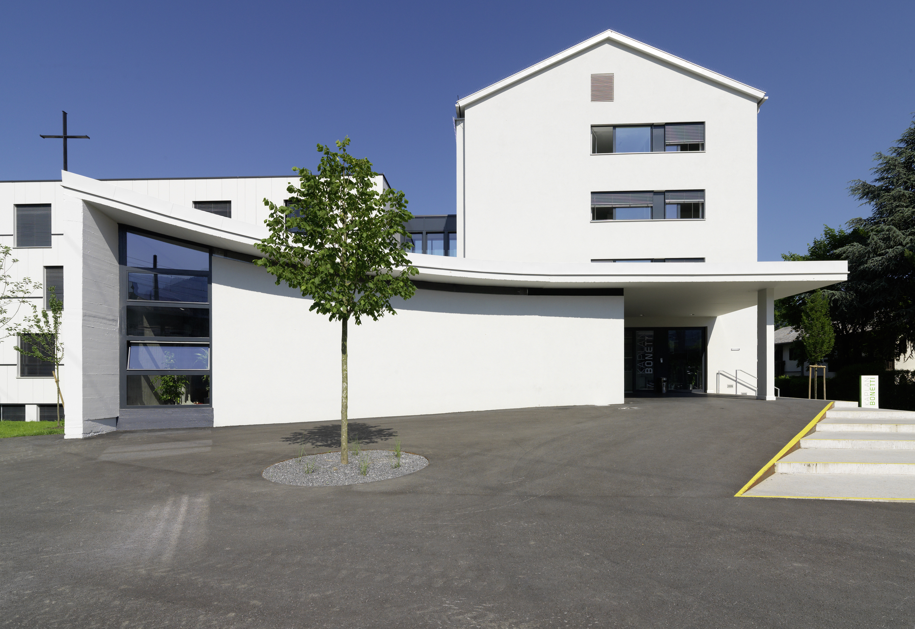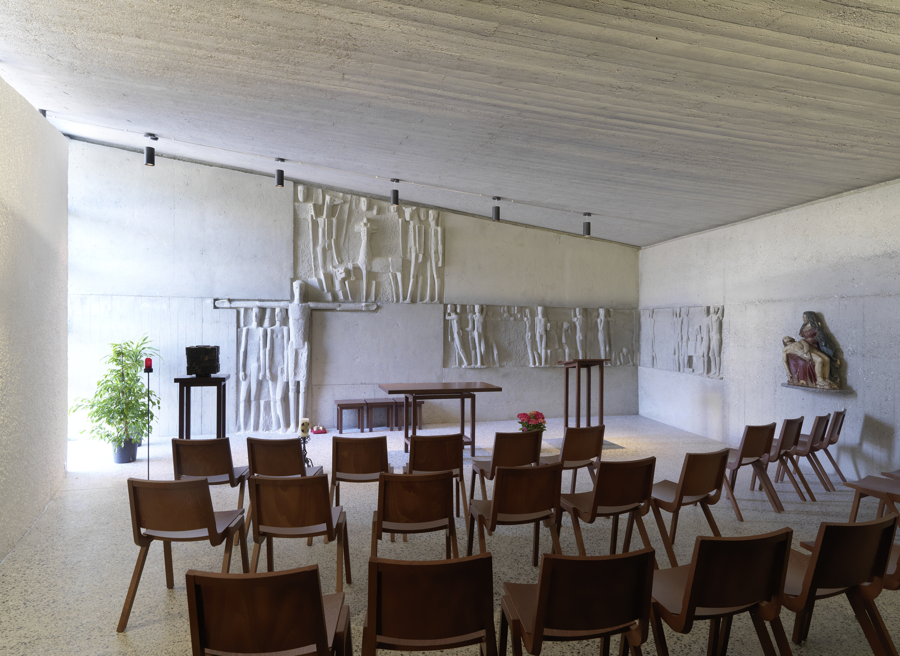 Mit dem Umbau und teilweisen Abriss des Ensembles ist zudem ein bemerkenswertes Beispiel moderner Vorarlberger Sakralarchitektur in den Vordergrund gerückt: Die angefügte Kapelle, wie das Wohnhaus ebenfalls von Hans Burtscher geplant, stammt aus dem Jahr 1960. Der Raum wurde sorgfältig saniert, mit einem Betonterrazzo und neuer Möblierung versehen. Das Wandrelief von Herbert Albrecht wurde original erhalten. Es entstand kurz vor dessen bekannter Portalplastik an der Klosterkirche Mehrerau in Bregenz. (Text: Tobias Hagleitner)