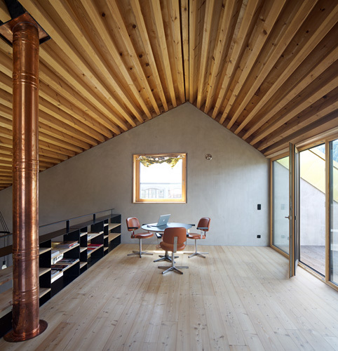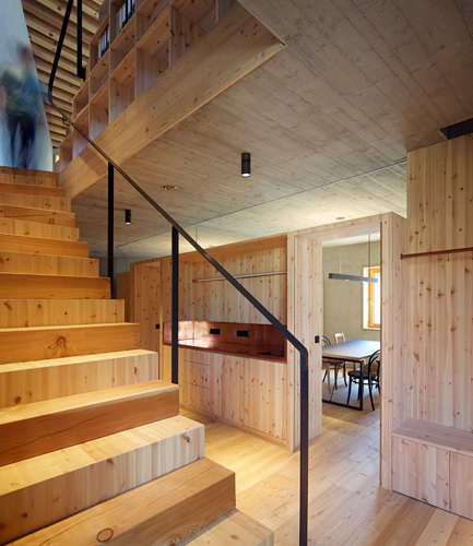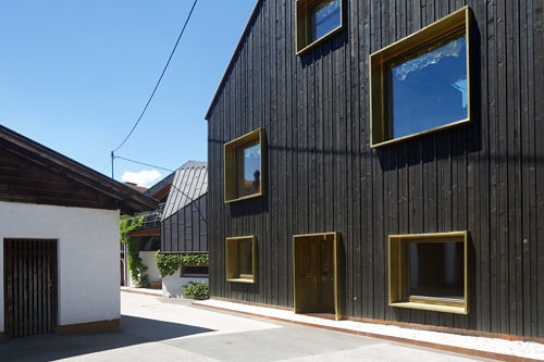 Mit nuancierten Abweichungen in der Materialwahl und den Detailausbildungen steht das Dorfhaus klar als neue Schöpfung da; Austritte und Ausblicke sind so gesetzt, dass sie unter anderem den gewohnten Blick auf das Alte wachrütteln und provozieren, aber nicht um des Provozierens willen, sondern um eben diese Art der Verschränkungen zu den Außenräumen, den unmittelbaren und den doch eher weiter entfernten, ganz klar in Beziehung zu setzen. Dieses Versprechen der äußeren Erscheinung erfährt seine Fortsetzung im Inneren. Einfache Raumfolgen im unteren Geschoss des Hauses; um so offener und „städtischer“ wird das Raumerlebnis, je weiter man nach oben kommt. Wohltuend die simple, überraschend einfache Detailausbildung der Konstruktionen, wohltuend weil materialgerecht und abseits der Normen funktionierend.