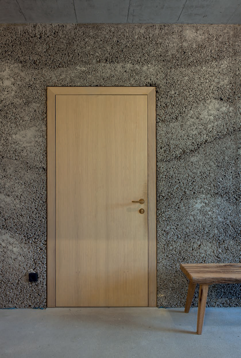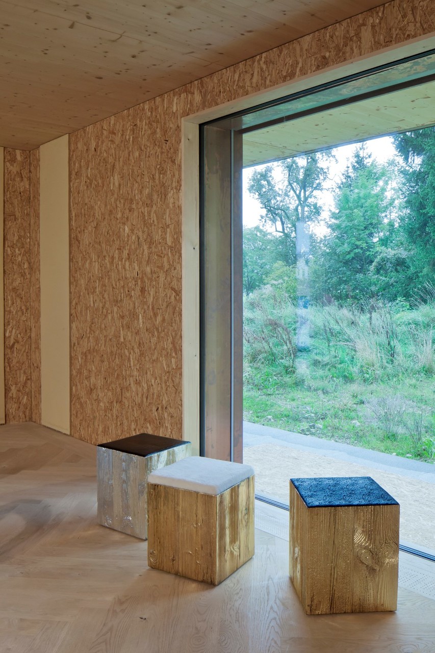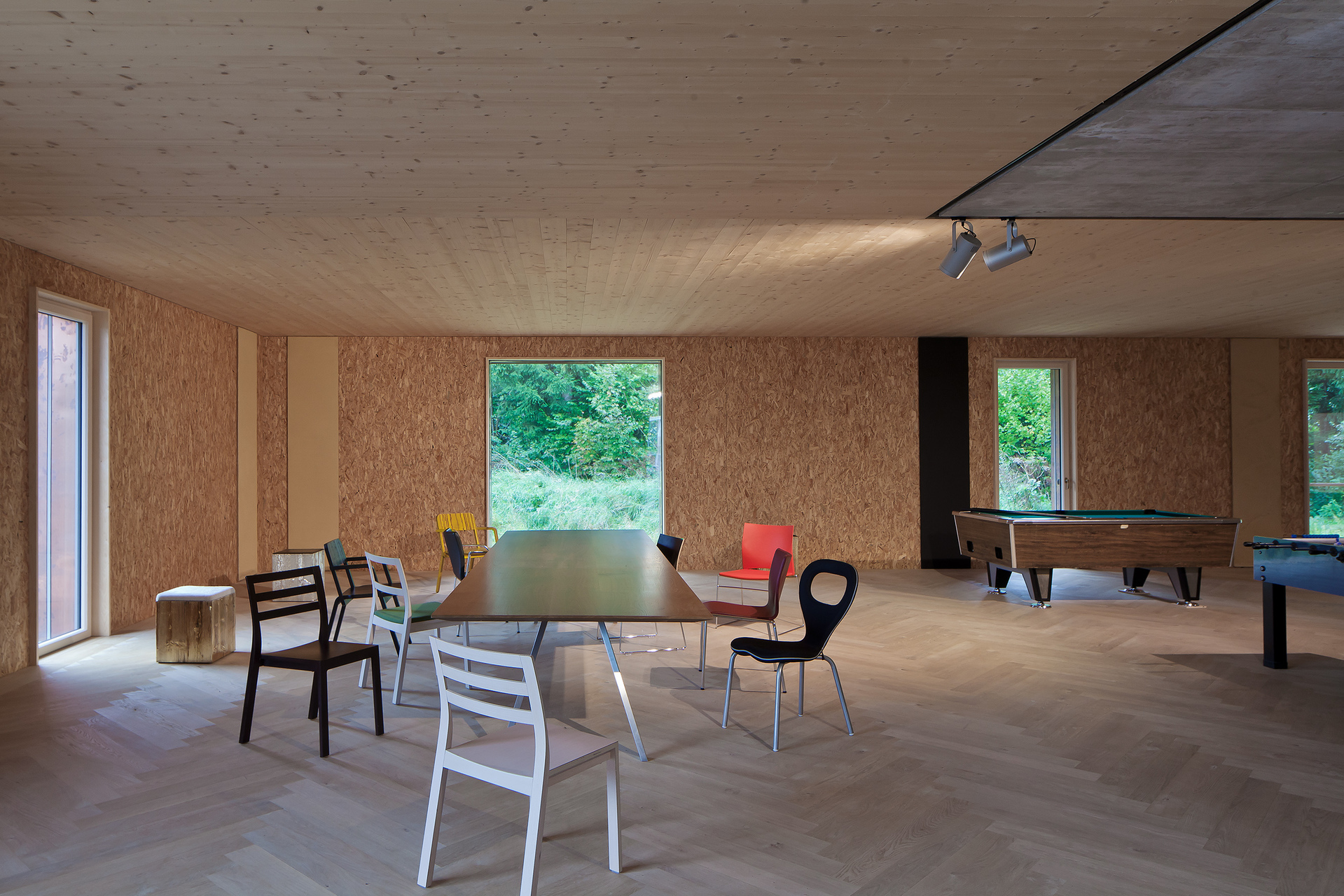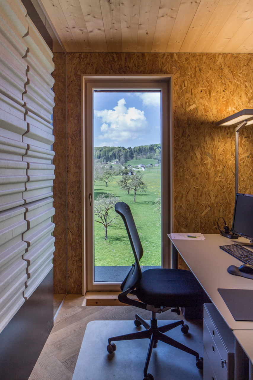 Die eigentliche Gebäudehülle besteht aus hoch gedämmten Holzriegelwänden, die mit senkrecht gestulpten Lärchenholzschindeln verschalt sind, auch eine Erinnerung an das einstige Sägewerk und die Tradition der Holzverarbeitung. Als Pendant zum ruppigen Stampfbeton hat Speigner die Innenseiten dieser Wände mit OSB-Platten beplankt. Die Böden der Büroräume sind mit einem geseiften Eichenboden, jene der Erschließungsbereiche wiederum mit einem terrazzoartigen Kunststein belegt.