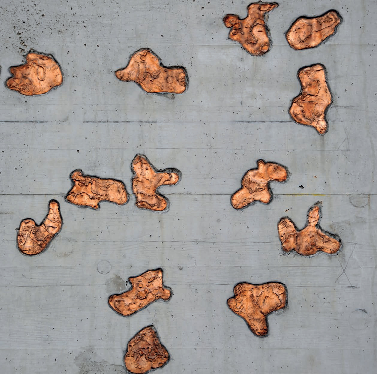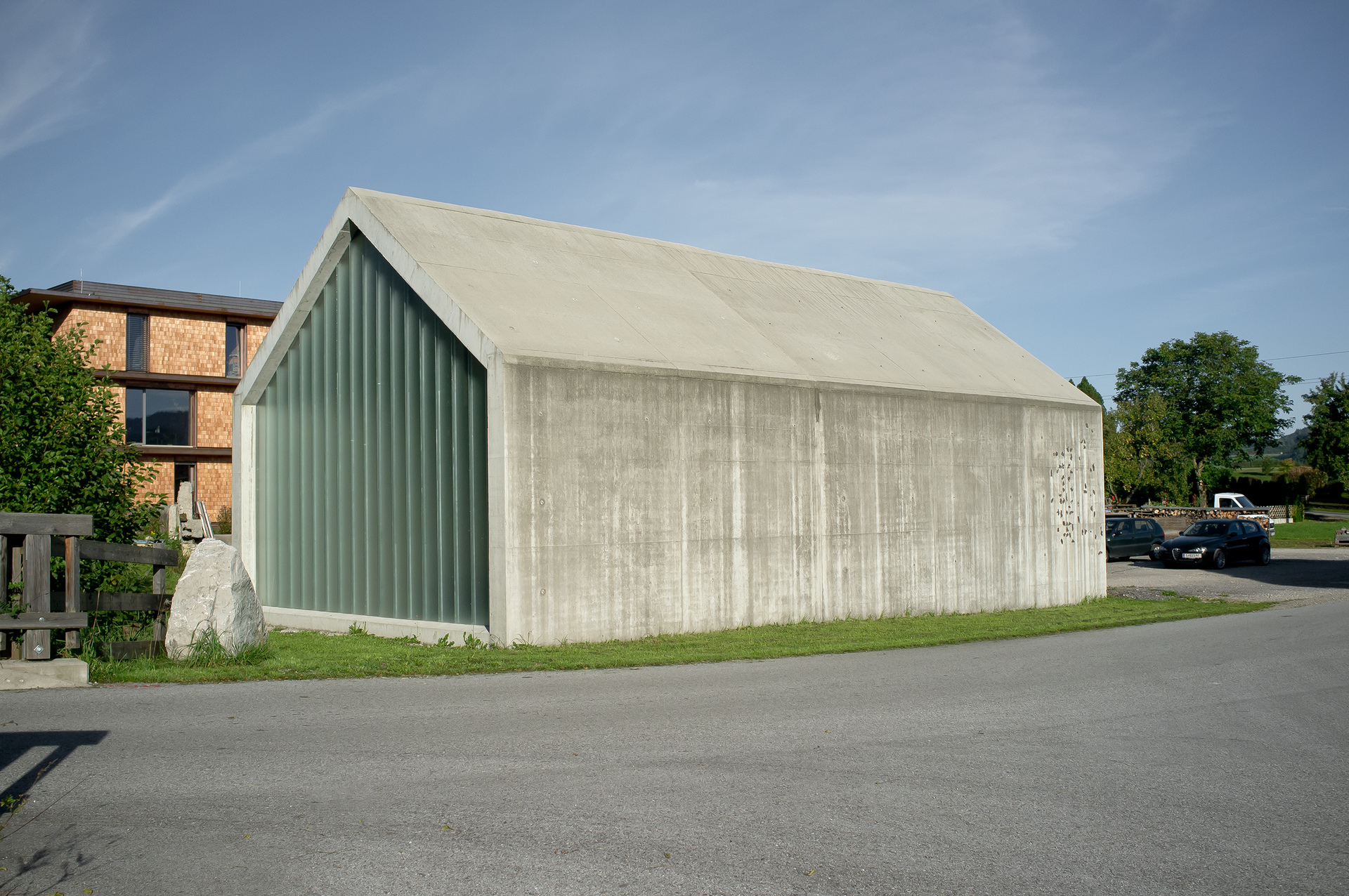Der kubische, dreigeschoßige Baukörper besitzt einen Kern aus Stampfbeton. Einschlüsse und Leerstellen, die zufälligen Grauabstufungen der einzelnen Betonmischungen ergeben ein lebendiges Bild, das Robustheit und Wärme gleichermaßen ausstrahlt.