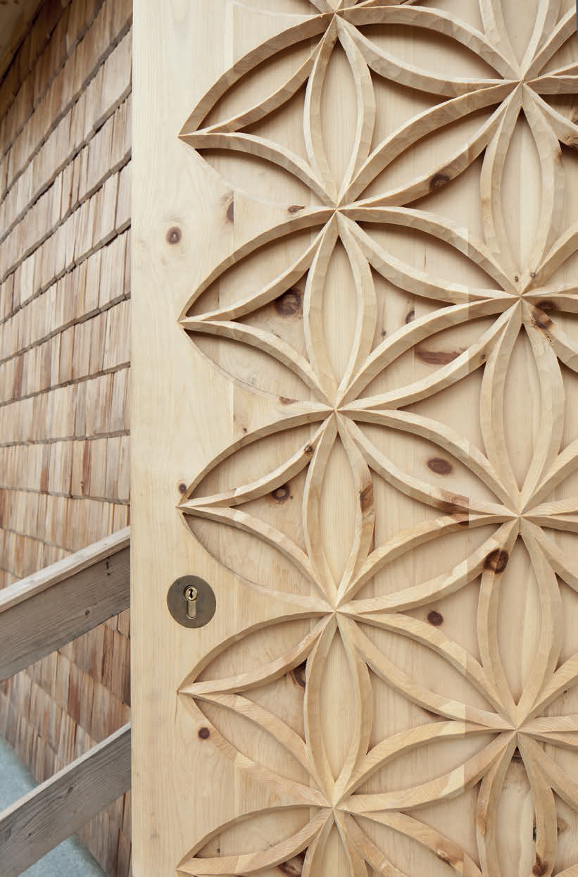 Horizontal wird der Bau geschoßweise durch die an den Fassaden vorspringenden Massivholzdecken gegliedert. An drei Seiten dienen sie als konstruktiver Holzschutz, an der vierten, der Südseite kragen die Decken soweit aus, dass sie auch die Funktion eines Balkons erfüllen.