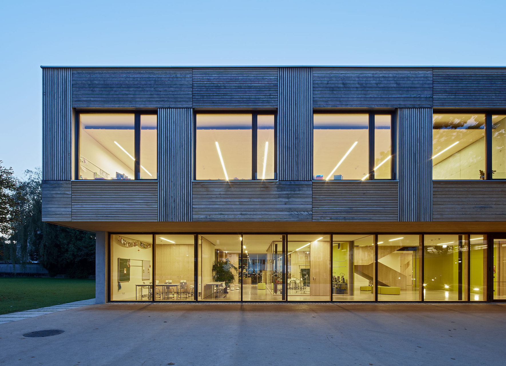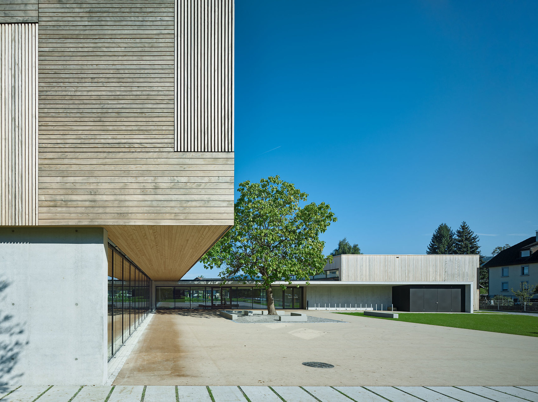 Die massive Konstruktion des Neubaus – Stützen in Stahl, Decken und Wände in Beton – wurde im Obergeschoß in Holzbauweise komplettiert und mit einer Fassade aus Weißtanne umhüllt. Die bis auf den Rohbau entkernte und komplett sanierte Sporthalle wurde ebenfalls mit einem hinterlüfteten Holzschirm neu eingekleidet. Winkelförmig angeschlossene Betonbänder längs der Nord- und Südfassaden verbinden Turnhalle und Aula außenräumlich miteinander. Sie bilden gedeckte Übergangsbereiche zwischen Pausenhöfen und Schulgebäude, im Bereich der Turnhalle werden sie zur Überdachung für die Fahrräder. Ein besonderes Farbkonzept ergänzt die kontrastierende Materialität aus gläserner Aula, ebenerdigen Funktionsräumen in Beton und Klassenzimmern in Holz: sanftes Blau in den Klassen, Lasuren in Grün- und Gelbtönen in den Bewegungszonen. (Text: Tobias Hagleitner)