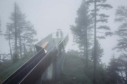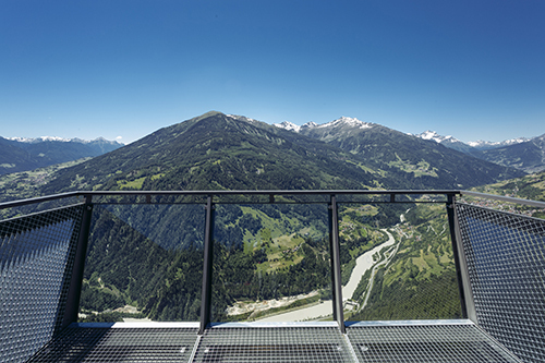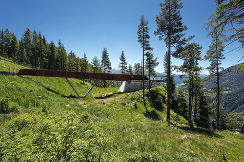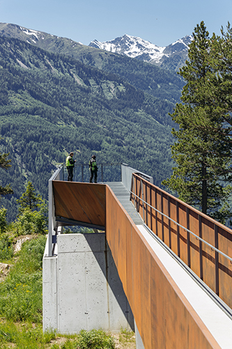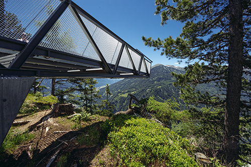 Vom Naturparkhaus aus führt ein neu angelegter Weg zur Aussichtsplattform. Der barrierefreie Steg mit drei Haltepunkten ist durch bewusst gesetzte Bepflanzungen als räumlich differenzierte Abfolge inszeniert. Ausgeführt in schlichten Betonelementen und hangseitig mit einem Handlauf versehen mündet der 200 m lange und 1,5 m breite Weg in eine Brücke und die weit über das hier 800 m steil abfallenden Gelände auskragende Plattform. Die Brücke ist mit Cortenstahl-Flanken eingefasst, die auf die Höhe des anschließenden Fachwerks ansteigen und in ihrer Verengung den Weg zur Plattform verstärken. Das nach vorne schmaler werdende Fachwerk sitzt auf Betonwänden auf, die den darunter liegenden brüchigen Felsen zusammenhalten. Die Ausführung der Plattform – Gitterroste am Boden und auf den Seiten sowie eine Glasfront ganz vorne – verstärken das Rundum-Erlebnis der Natur an dieser extrem exponierten Stelle.