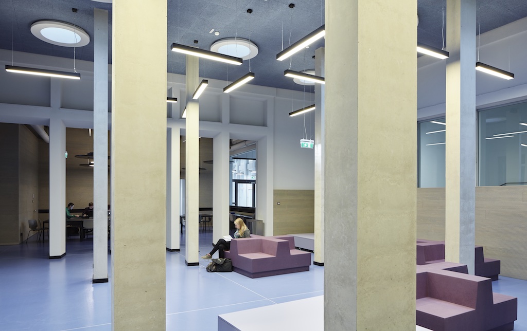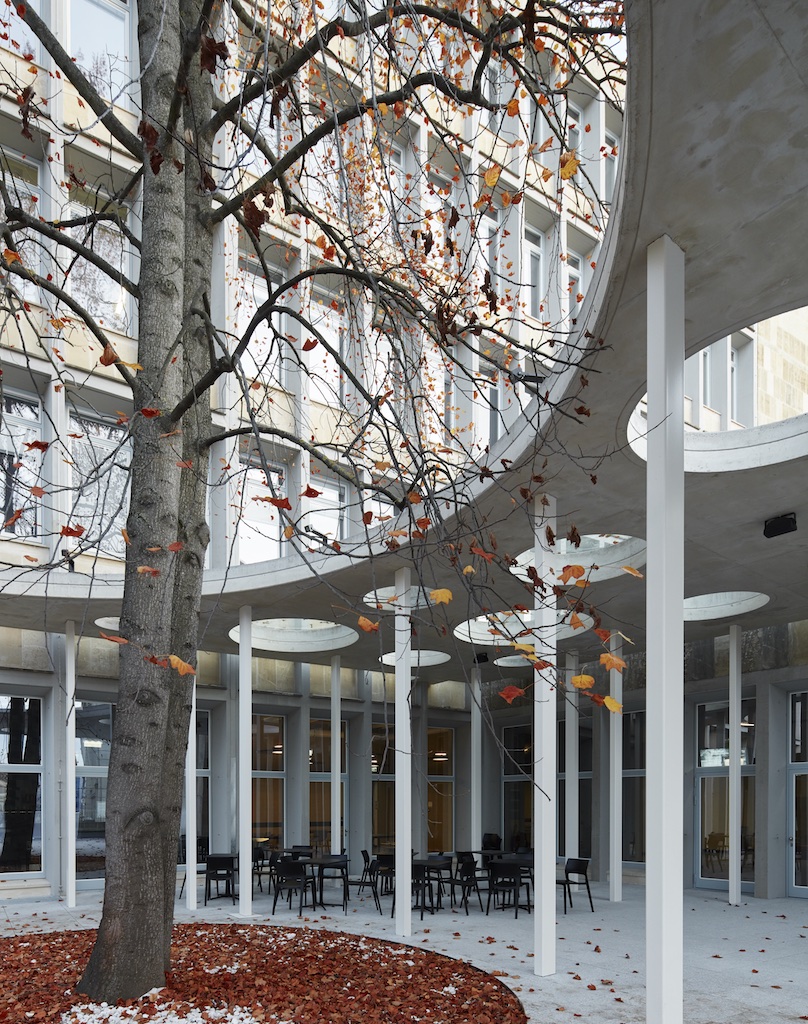 Die übrigen Obergeschoße wurden als großzügige Lehr-, Büro- und Forschungslandschaft der Biomedizinischen Fakultät umgestaltet. In den einzelnen Institutsgeschoßen wurde die strenge zweihüftige Zonierung durch eine offenere und die bestehenden strukturellen Raumqualitäten nutzende Abfolge von Bürosequenzen aufgegeben. Mit der offenen Struktur wurde auf die aktuellen, kommunikativen Anforderungen im Lehr- und Forschungsbetrieb eingegangen. Eine eigene abgehängte „Layerschicht“ unterhalb der freigelegten Stahlbetonrippendecke versorgt flexibel adaptierbar die Arbeitsplätze mit den erforderlichen Medien. So entstanden differenziertere und zum Teil flexibel auf die jeweiligen Arbeitssituationen anpassbare Bürozonen.