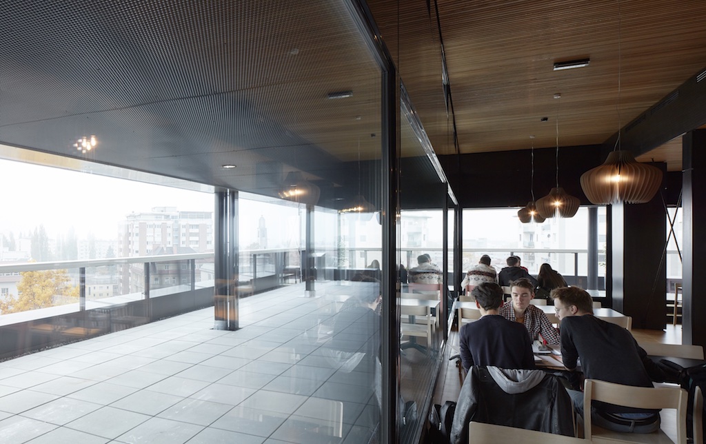 Das Erdgeschoss wurde als zentrales Verbindungsglied zwischen den Fakultätsgebäuden an der Stremayrgasse und dem restlichen Campus umstrukturiert. Es entstand ein für alle Studierenden zugängliche öffentliche Zone bestehend aus einer Fachbibliothek, dem renovierten Hörsaal, Lern- und Aufenthaltsbereichen mit direkten Zugängen zu den neu geschaffenen unterschiedlichen Aufenthaltszonen im Außenbereich. Nach Außen tritt die Umgestaltung nur in Form des einprägsamen Vordaches über der Terrasse am Westeingang in Erscheinung, welches diese Zone vor dem Café und den Studierzonen zu einem Treffpunkt am Campus mit Aufenthaltsqualität werden lässt.