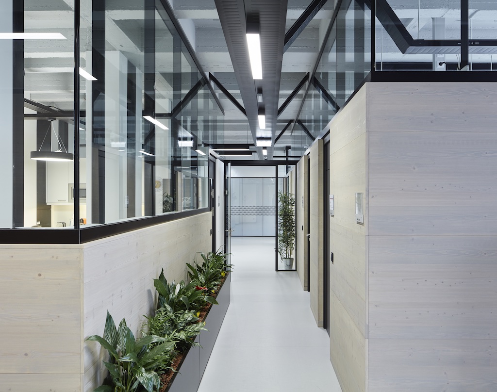 Sämtliche neuen Ausbauteile im Bestand wurden basierend auf ihren Potentialen für ein optimales Raumklima (in optischer, klimatischer und haptischer Hinsicht) ausgewählt. Die Adaptierung sämtlicher Innenraumzonen ist eng mit den Überlegungen zur energetischen und haustechnischen Optimierung des Gebäudes verknüpft. Somit wird eine bewusste Materialwahl in Verbindung mit der Bestandsstruktur, anstelle eines ausufernden Einsatzes von technischen Hilfsmitteln im Bereich der Raumkonditionierung, zum grundlegenden Gestaltungskonzept – einem integralen Planungsansatz.