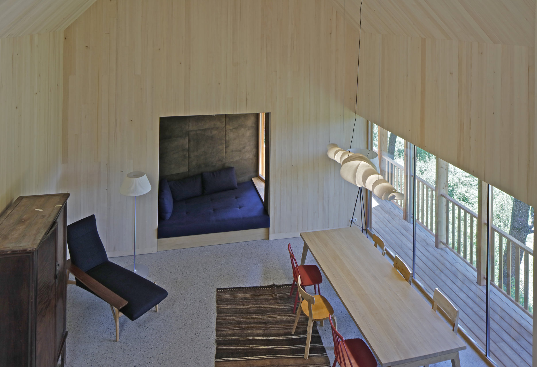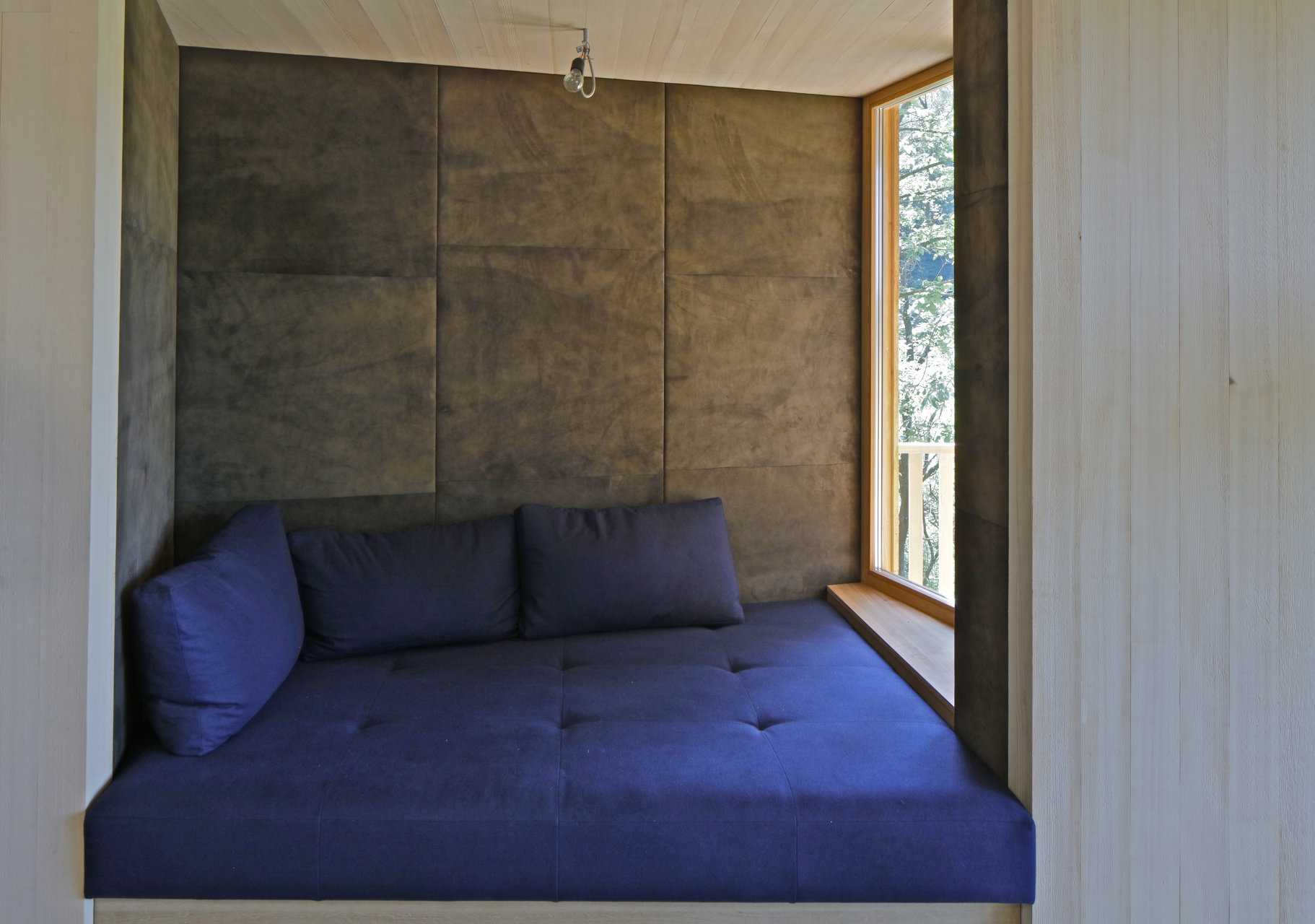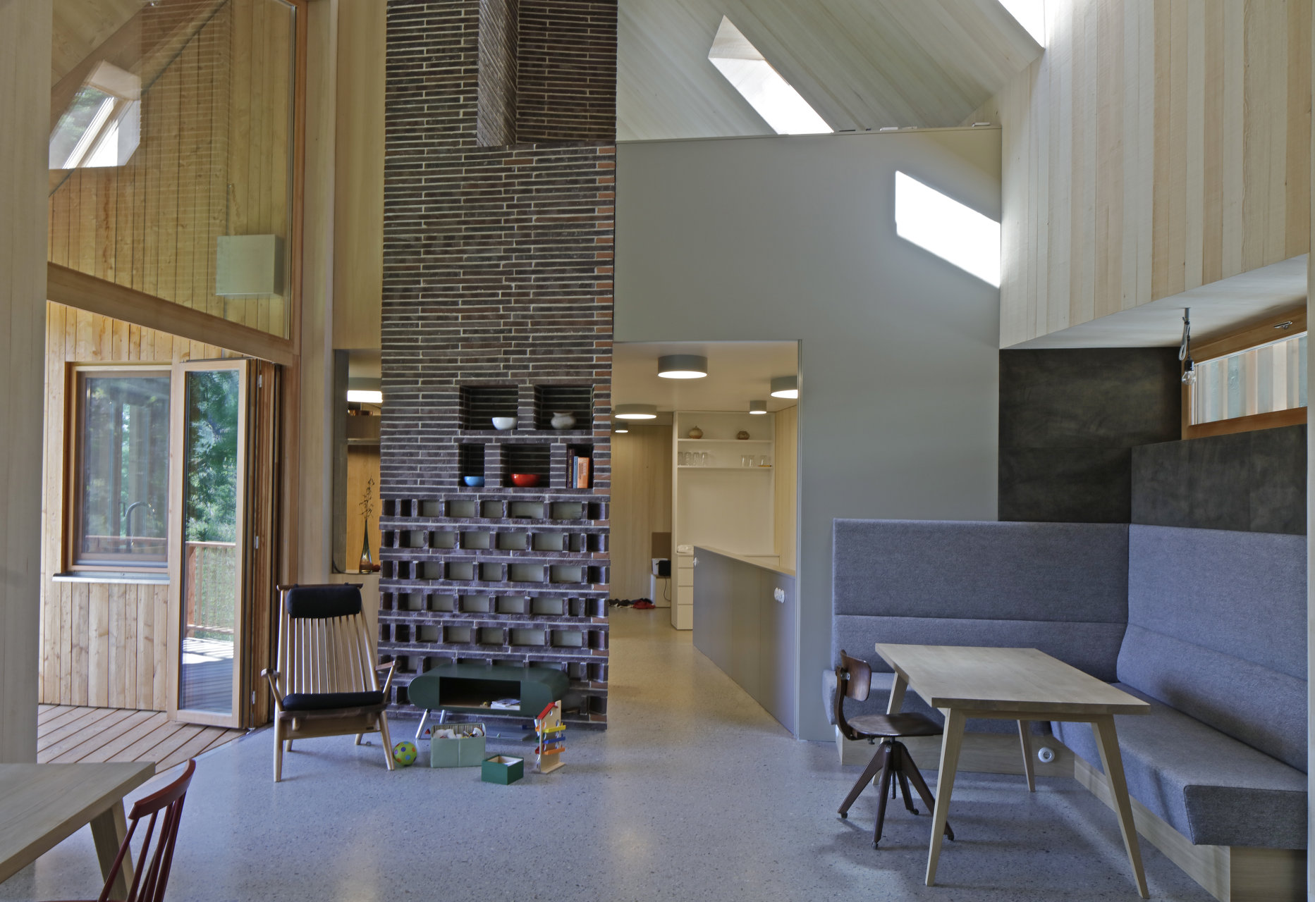Der Scheitbrennofen erhitzt im Untergeschoss die umliegenden Wände, daher ist hier auf der Rückseite das Bad angeschlossen. Durch ein großes Sichtfenster kann man auf der Vorderseite hingegen den Brennvorgang vom gemeinsamen Sitzbereich beobachten.