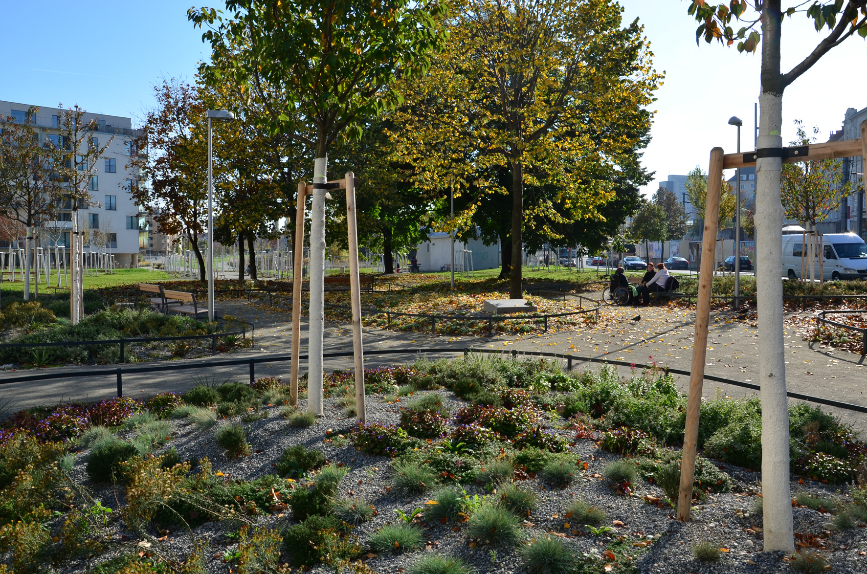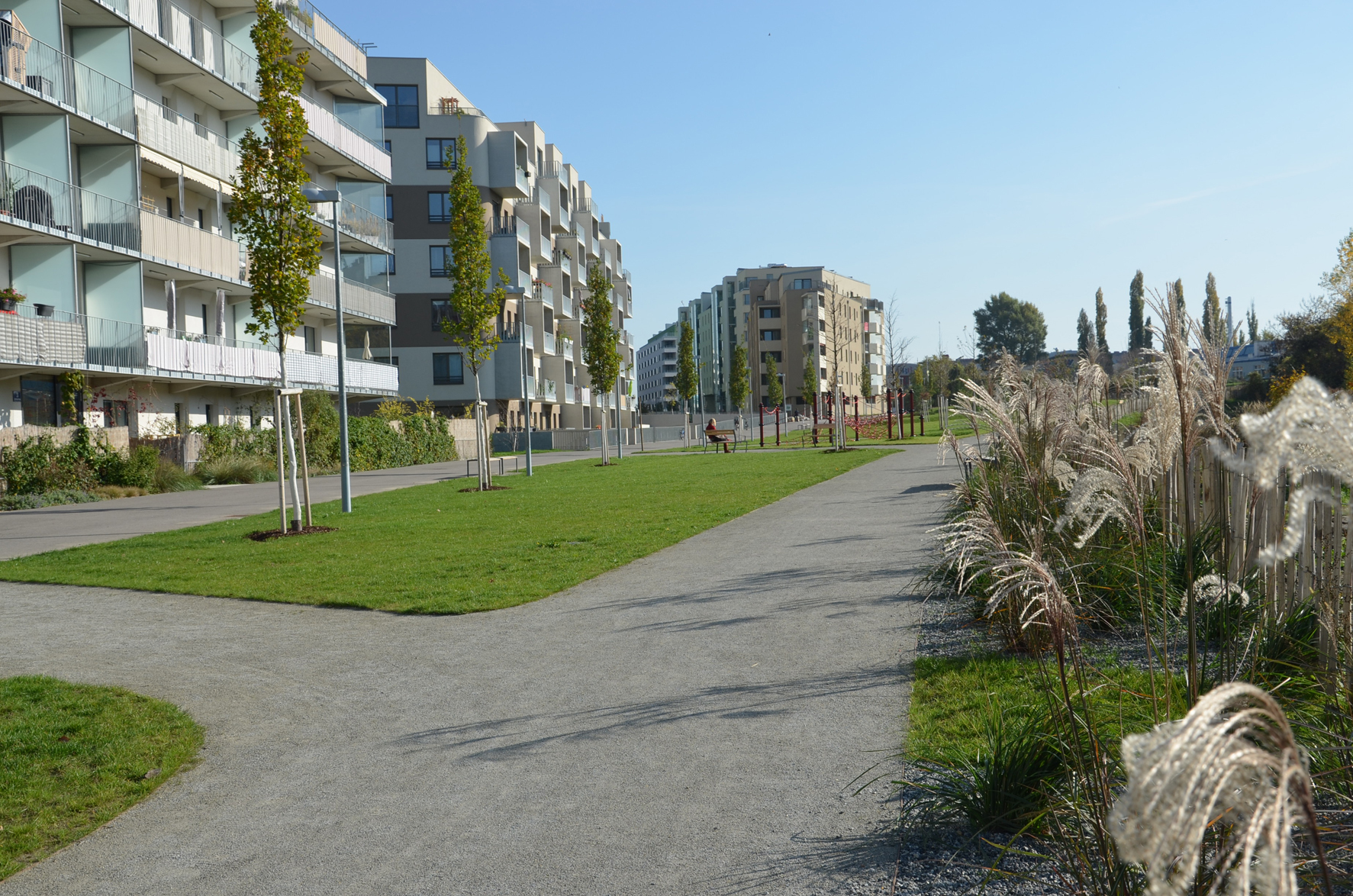 Begehbare Kiesbeete mit Wildstauden entlang der Wegachse im Baumhain zitieren die Schotterstreifen der Bahnanlagen. Gräserparavents bilden filigrane Raumgrenzen mit Durchgängen zu einer temporären Stadtbrache. (Text: Karl Grimm)
