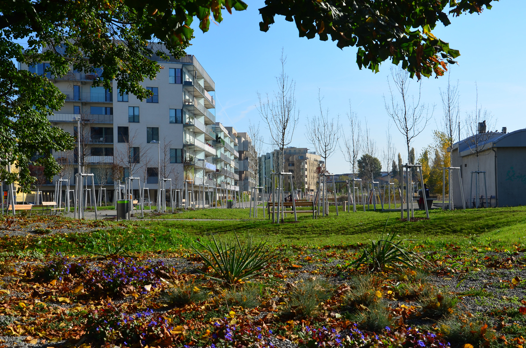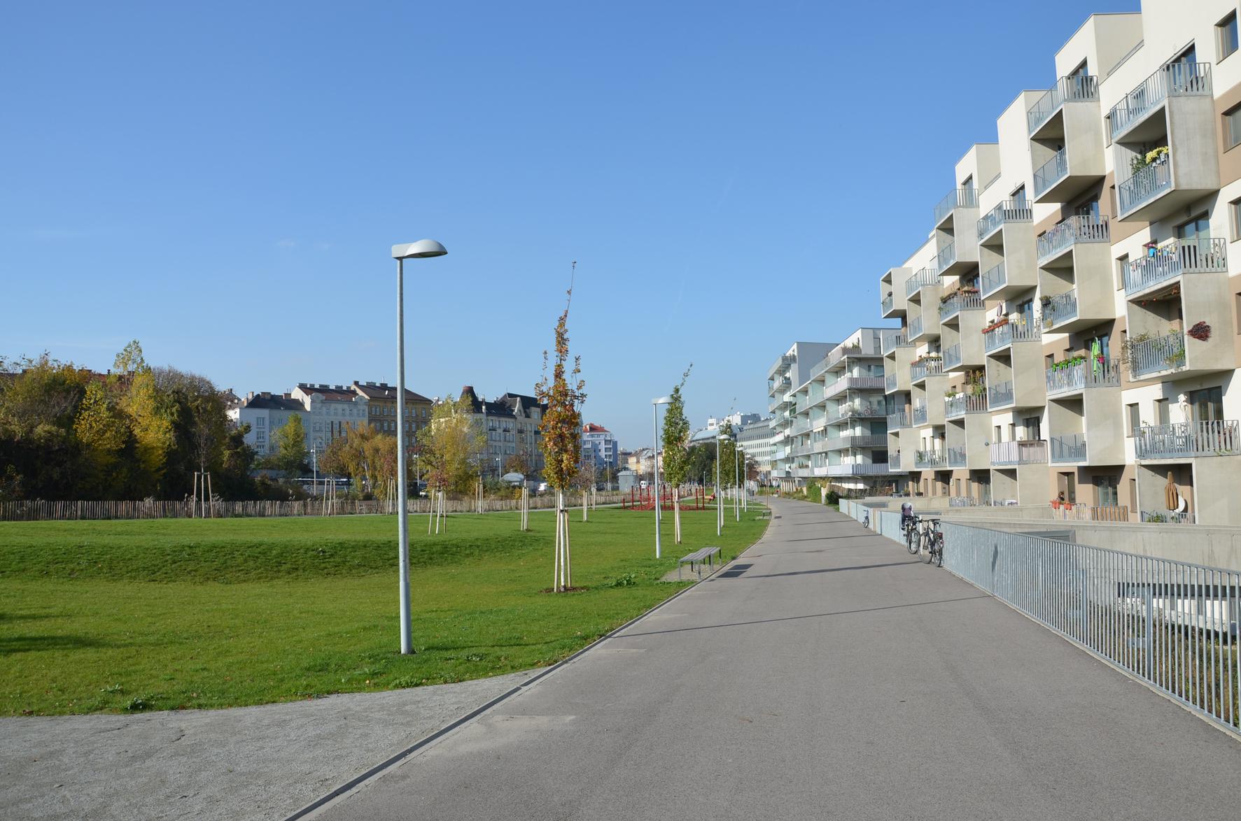 Der unregelmäßig geformte, langgestreckte Park wird als Sequenz deutlich unterscheidbarer Räume gestaltet: Ein sonniger Gartenplatz am Platz der Opfer der Deportation wird vom markanten Altbaumbestand eingefasst. Es folgt ein Baumhain, dessen geometrische Struktur in der Anwuchsphase durch weiße Stämme und weiße Pfähle manifest wird. Nach einer Engstelle steigt der Park als grüner Wiesenteppich mit lockerem Baumbestand leicht an. Eine Säuleneichenreihe entlang der Promenade unterstreicht den weit geschwungenen Anstieg.