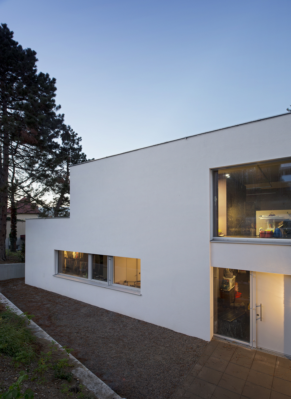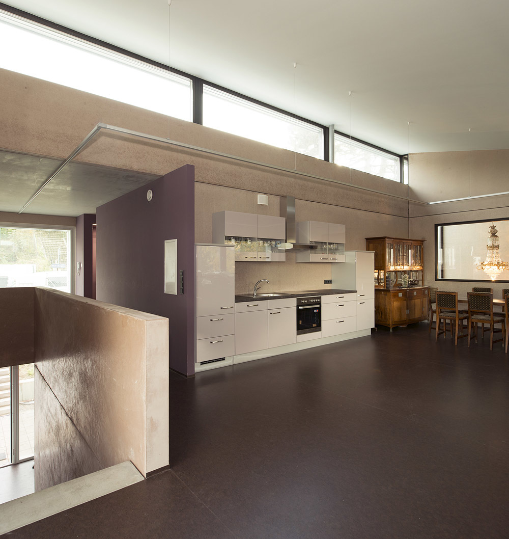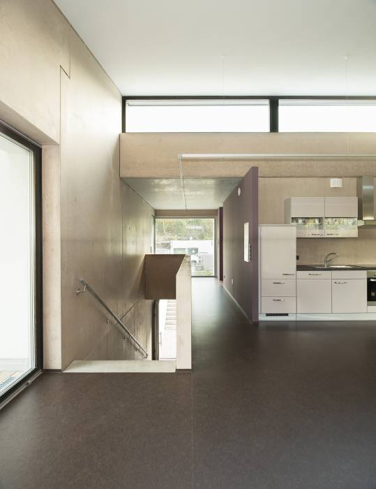 Das Farbkonzept für den Innenraum wurde durch die rotgrauen Sichtbetonflächen und dem Wunsch der Bauherrin nach einem fugenlosen Boden, wegen ihrer Hunde, bestimmt. Ein rotbraun schillernder Linoleumboden trifft auf eine dunkelviolette Stiegenhauswand sowie ein kräftiges Blau im Schlafzimmer. Zusammen genommen ergeben alle Farbkomponenten eine harmonische Stimmung. Das Thema Sichtbeton ist im ganzen Gebäude präsent. Wände, Decken, Stufenoberflächen und Brüstungen sind aus Fertigteilen hergestellt worden und verfügen über eine makellose glatte Oberfläche. Selbst Stützmauern der Außenanlagen, die Garagenzufahrt und die, den Briefkasten beherbergende Stehle, sind in Sichtbeton gehalten. (Text: Architekt)