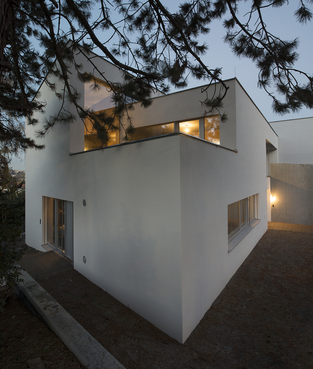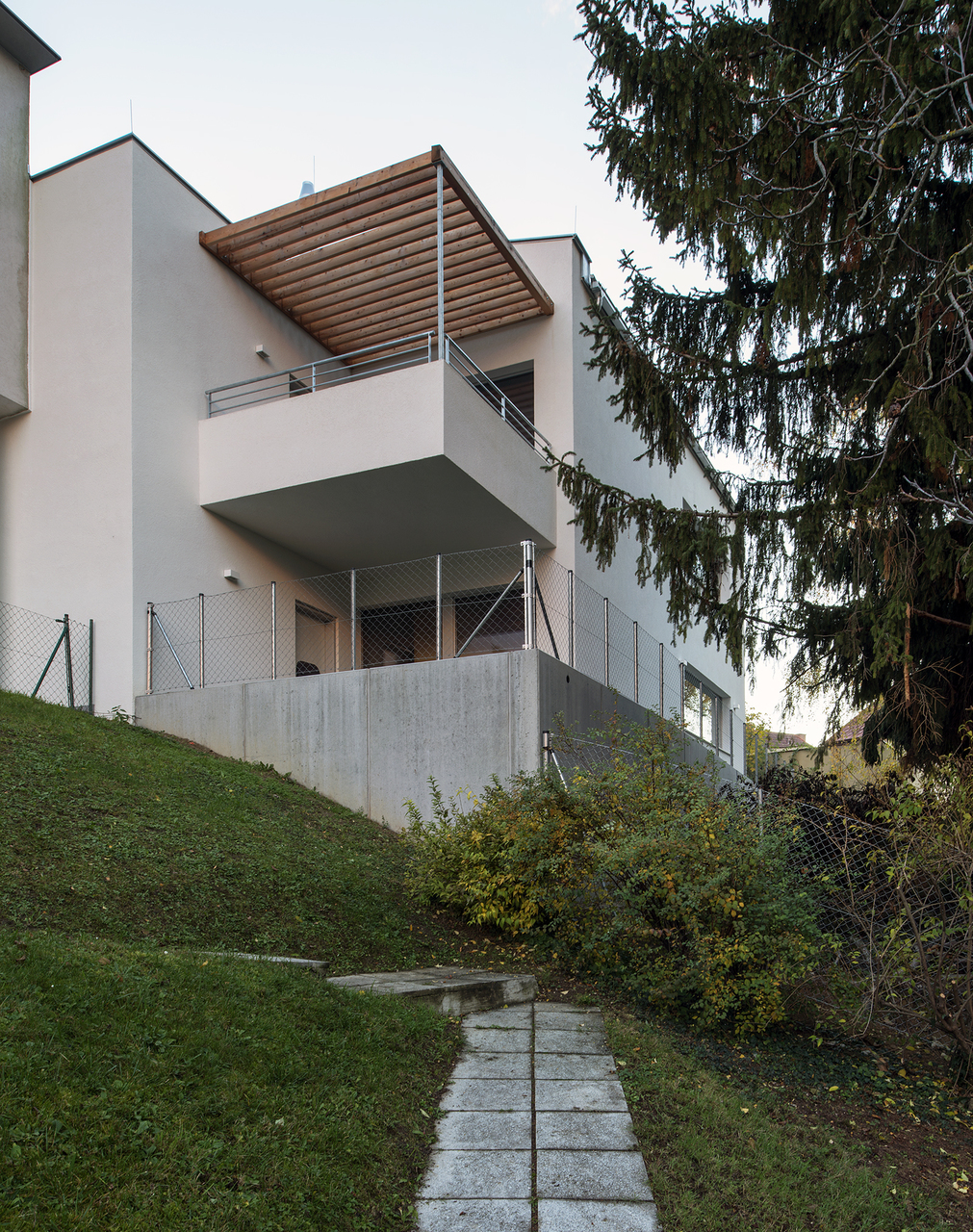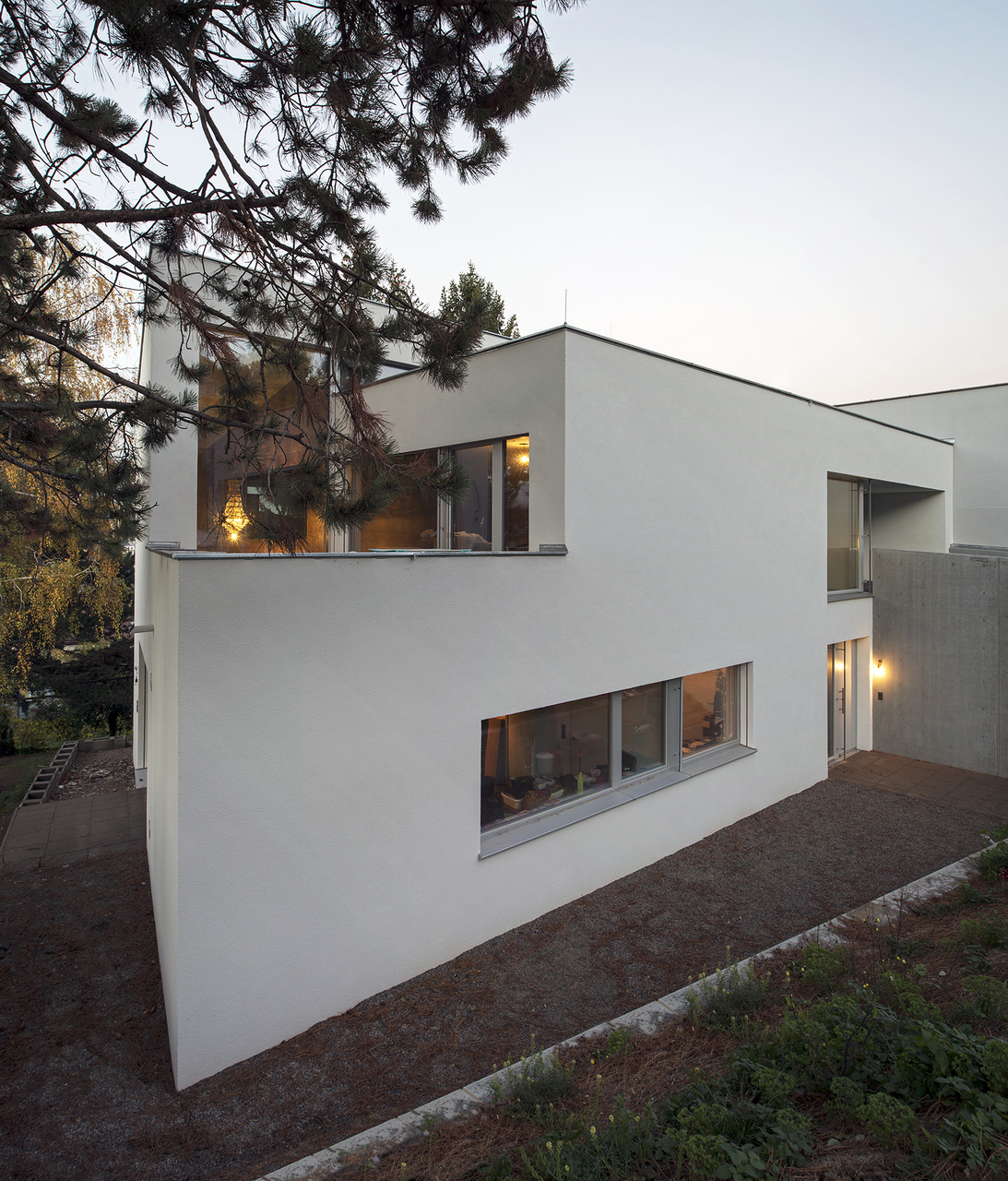 Der steil abfallende Nordhang erforderte eine besondere Herangehensweise: Sonnenlicht von der höher gelegenen Straßenseite musste bis tief in das Untergeschoß geleitet werden, ohne den Passanten Einblick in das Gebäude zu gewähren. Über einen Luftraum von der Westterrasse aus wurden unten liegende Räume mit der Energie der Sonne versorgt.