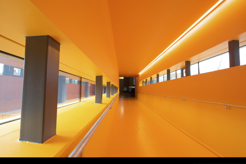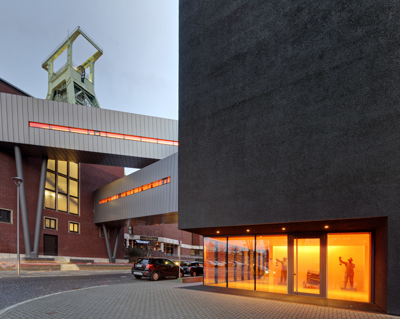 Für das Team von Benthem Crouwel (Amsterdam / Aachen), das derzeit auch den Anbau des Amsterdamer Stedelijk-Museums fertigstellt, war das majestätische Bergbaumuseum aus der Ära des Industriezeitalters, wie es von Krupp und Haniel geprägt wurde, eine Herausforderung. Als sich die Architekten 2006 an dem Wettbewerb beteiligten, wurde ihnen schnell klar, dass der Altbau nach einem expliziten Gegengewicht verlangt, was sie mit deutlichen Anleihen am Expressionismus und an der Bauhaus-Moderne zu bewerkstelligen suchten. Entstanden ist ein Anbau, der die einen an Kasimir Malewitschs Schwarzes Quadrat denken lässt. Andere, insbesondere einheimische Ruhrpottler, erinnern sich vielleicht an die Zeit der Kohlenförderung und assoziieren dabei einen «schwarzen Diamanten». Tatsächlich hat sich mittlerweile in Bochum die Redewendung vom «schwarzen Diamanten» eingebürgert. Benthem Crouwel entschieden sich für einen schwarzen Kubus, der lediglich im ersten Augenblick hermetisch wirkt. Während Farbe und Gestalt das Fördermaterial Kohle evozieren, von dem die gesamte Region seit dem frühen 19. Jahrhundert lebte, taucht gleichzeitig der Querschnitt des Bergwerks mit seinen Gängen, Stollen und Rampen vor dem geistigen Auge auf. Daran gemahnen die beiden «Bandbrücken», die den Freiraum zwischen Alt- und Neubau überspannen und sich dabei dramatisch überkreuzen. Die Architekten sparten gleichwohl nicht mit heiteren Farben, und so behandelten sie sämtliche neuen Erschliessungswege – die beiden Rampen, auf denen man zu den Wechselausstellungen im Anbau gelangt, und das neue Stiegenhaus – mit poppigem Melonengelb, bestehend aus einer Polyurethanbeschichtung des Betons.Benthem Crouwel bevorzugen kräftige Farben: Zu dem Schwarz, das auf die fugenlose raue Putzoberfläche des Museumskubus aufgetragen und mit glitzernden Siliciumcarbid- Splittern vermengt wurde, tritt also das grelle Melonengelb, das sich bestens zum expressionistischen Aspekt des Anbaus gesellt, nämlich den Zickzacklinien des Fensterbandes, die vom Erdgeschoss bis hinauf in die zweite Etage verlaufen. Die schwarze Putzfassade, die vor den tragenden Stahlbetonwänden abgehängt ist, kontrastiert auch mit der Glasfassade des Foyers. Abends, wenn die Beleuchtung angeschaltet ist, kommunizieren die Zickzacklinien mit den schmalen Fensterschlitzen der Verbindungsrampen und sorgen für anregende Farbeffekte. Bei Tageslicht entdecken die Museumsbesucher, dass sich die gezackten Fensterbänder auf dem Dach fortsetzen und den Blick auf den Förderturm freigeben.