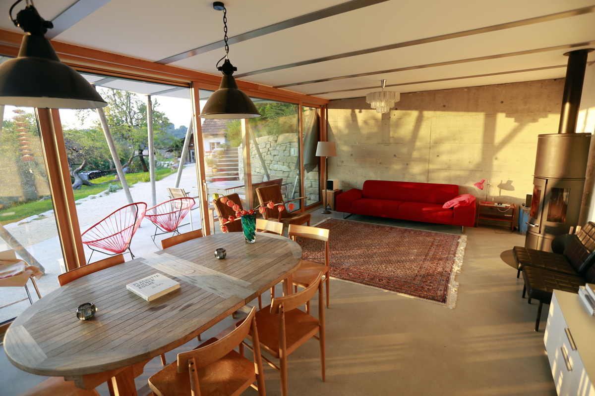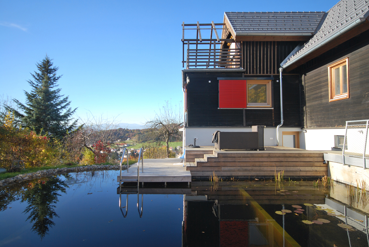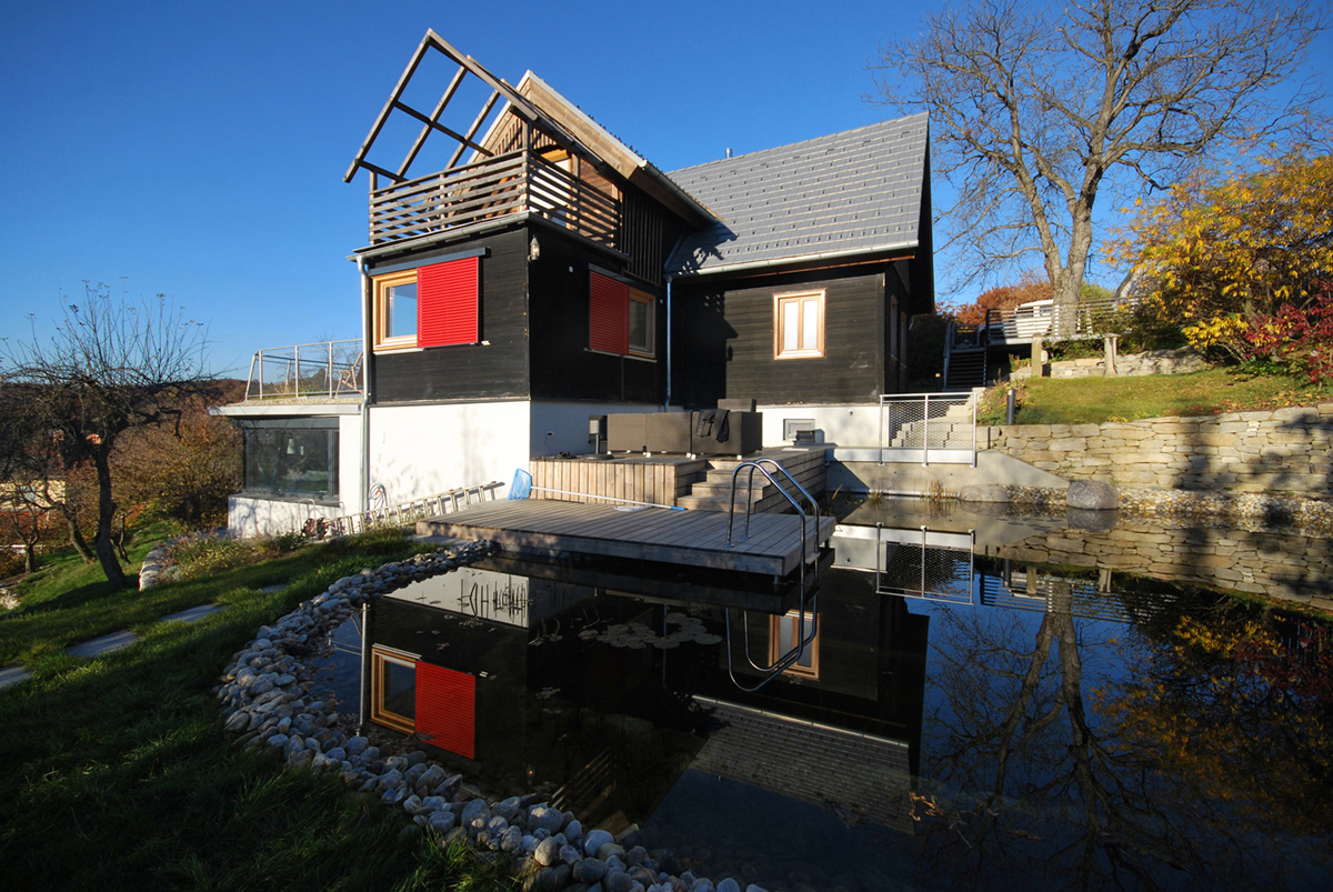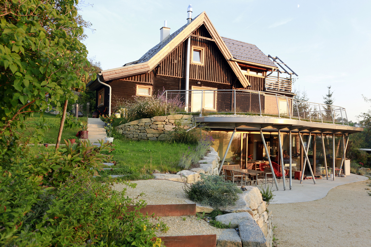Das Holzhaus des Grossvaters aus der Siedlerbewegung der 1930er Jahre wird an die heutigen Bedürfnisse einer vierköpfigen Familie angepasst. Die bestehenden 90 m² Wohnfläche sollen auf 140 m² vergrößert werden. Damit das Ursprungshaus auch als solches zu erkennen bleibt, wird der Zubau als weitere Geländeschicht in den Hang gebaut.Das bereits mehrmals umgebaute Haus wurde um weitere 50 m 2 Wohnfläche vergrößert. Die Lage am Hang ermöglichte es, den Zubau an das bestehende Kellerniveau anzubinden und gleichzeitig den Blick ins Tal – durch eine raumhohe Verglasung – zu öffnen.