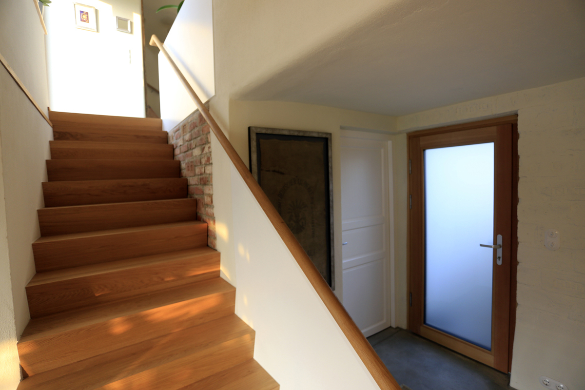 Der Bestandsbau erhielt zwei neue Bäder, alle Oberflächen wurden adäquat saniert, und die Außenwände von innen gedämmt. Das Heizsystem wurde von einer Ölheizung auf eine Pelletsheizung umgestellt. Das Dach wurde gedämmt und neu gedeckt, die darunterliegenden Zimmer durch neue Fensteröffnungen belichtet.