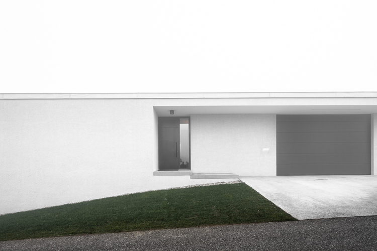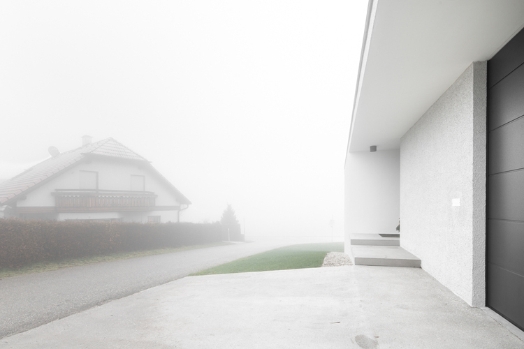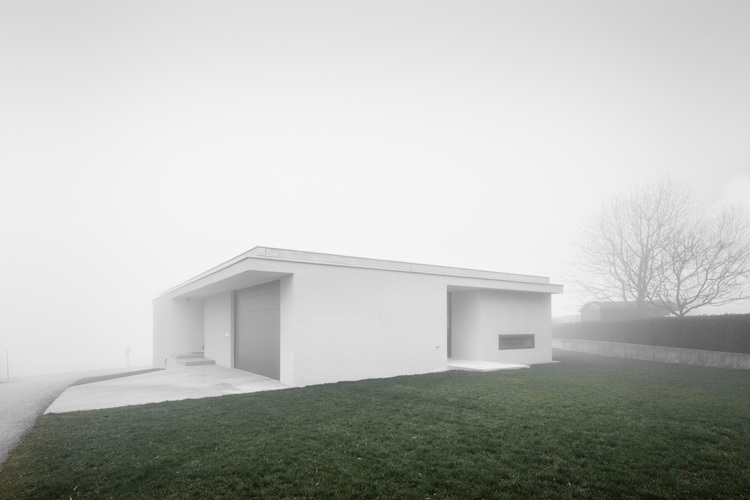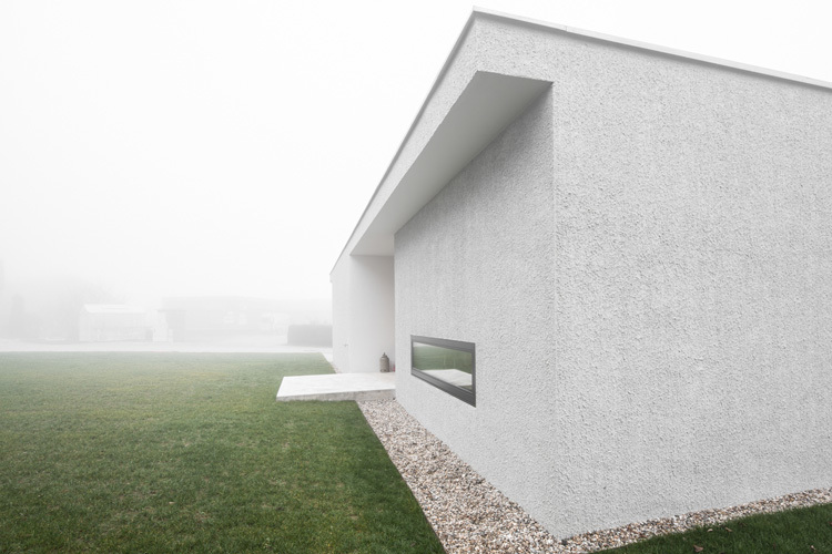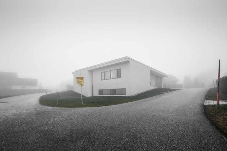 Aus der Sicht des Vorbeifahrenden zeigt sich das Haus gemäßigt und verbirgt die heimliche Tiefe, die erst der zweite Blick und der Eintritt offenbart. (Text: Architekt)