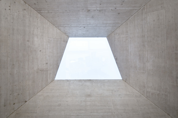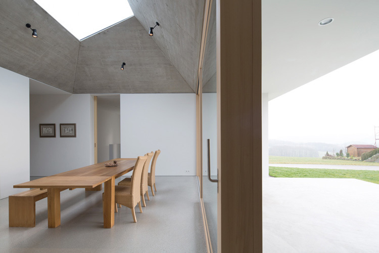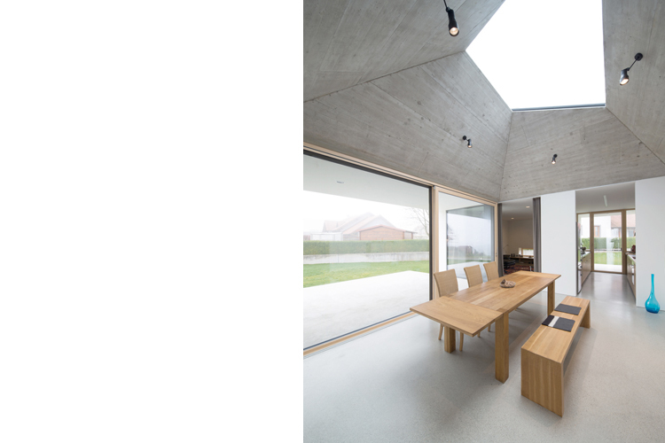 Der Zentralraum, genutzt als Speisesaal und Salon, bietet den Bewohnern Großzügigkeit und besondere Aufenthaltsqualitäten an. Der Raum öffnet sich zum Himmel als Pyramidenstumpf und Richtung Süden zur angebunden Gartenterrasse.