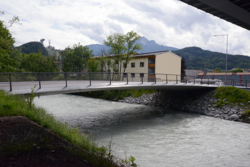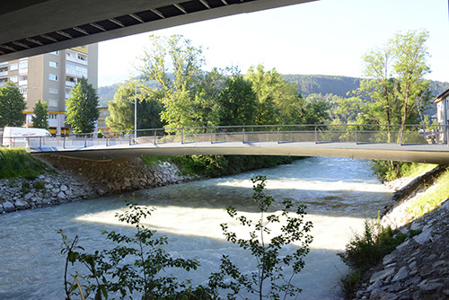 Um die Schlankheit des Tragwerks zu unterstreichen wurden die Widerlager zur Gänze in die Uferböschungen integriert. Zusätzlich betont wird die Schlankheit durch den seitlichen Abschluss des Randbalkens in Form eines sich nach außen zu einer Spitze verjüngenden Stahleinlageteils. Als Absturzsicherung dient ein 1,2 m hohes Geländer mit einem einfachen Handlauf und einem engmaschigen Seilnetz als Geländerfüllung. (Text: Claudia Wedekind)