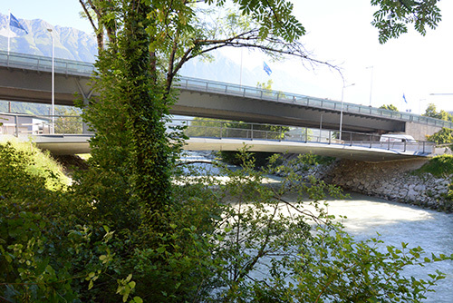 Die schlichte und elegante Brücke mit einer Spannweite von 37 m ist als integrale Brücke konstruiert, ein Konzept bei dem Widerlager und Tragwerk zu einem zusammenhängenden Ganzen verschmelzen. Konkret sind die Stahlbeton-Widerlager biegesteif mit dem in Spannbetonbauweise hergestellten Tragwerk verbunden. Die Ausnutzung der Einspannung der Tragwerksenden in die Widerlager in Kombination mit der Längsvorspannung ermöglichte eine sehr schlanke, aber gleichzeitig robuste Tragwerkskonstruktion ohne wartungsintensive und in ihrer Lebensdauer begrenzte Fugenübergänge und Lager.