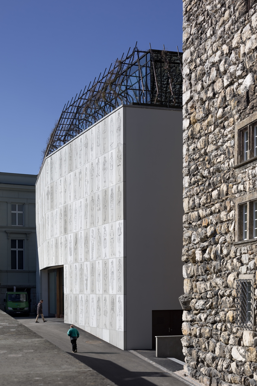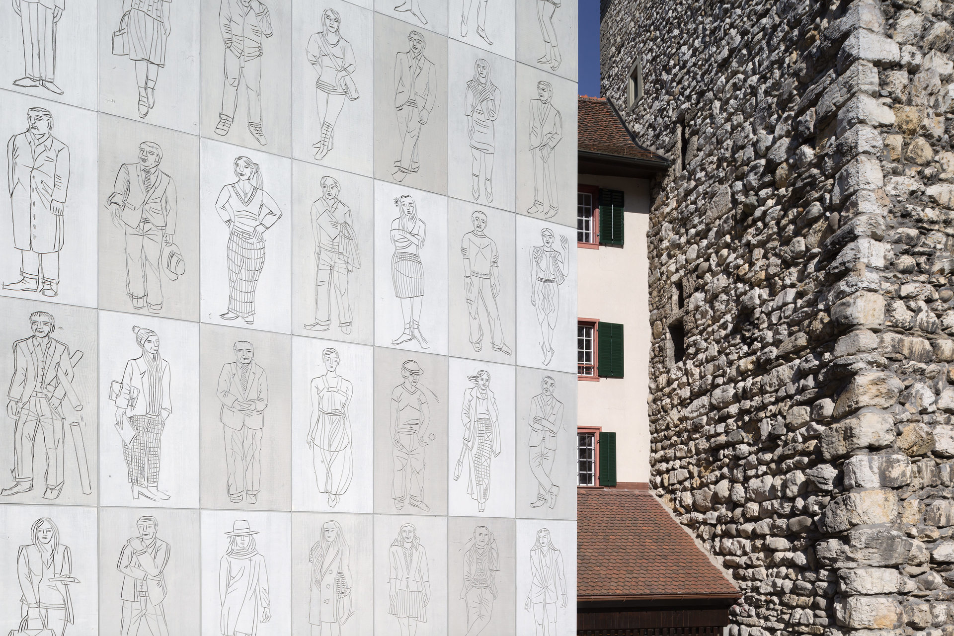 Das umsichtige in den Kontext eingepasste Volumen mit einem verglasten Staffelgeschoss und einem Knick in der Eingangsfassade weicht zu den beiden historischen Nachbarn hin vorsichtig zurück und bildet zudem noch einen geschützten Bereich vor den verglasten Eingangsschiebetüren aus. So umsichtig das Volumen modelliert in Erscheinung tritt, so plakativ und geradezu fordernd gibt sich die Gestaltung der vorgehängten Fassade aus vorgefertigten Betonelementen: 134 Menschen in Lebensgröße blicken dem Eintretenden entgegen. 134 individuelle Zeichnungen von Männern und Frauen in zeitgemäßer Kleidung, vermeintlich in den Beton eingraviert, konfrontieren den Betrachter mit einem in der zeitgenössischen Architektur kaum eingesetzten figürlichen Ornament. Dieser ungewöhnliche Anblick erzeugt die Aufmerksamkeit, die einem Museum gebührt. Nicht zuletzt rufen die figürlichen Darstellungen Erinnerungen an die Malerei der Neoexpressionisten aus den 80er Jahren hervor. Und dies nicht von ungefähr: Der St. Galler Künstler Josef Felix Müller, der die Vorlagen für die Abgüsse geschaffen hat, wurde in den 80er Jahren u. a. mit seinen rauen, ausdrucksstarken Holzskulpturen bekannt. Wie damals benutzte der Künstler auch beim Stadtmuseum Aarau eine Motorsäge, um die Menschenbilder der Fassade auf Holztafeln zu skizzieren. Das Holz eines Mammutbaums, der der Erweiterung weichen musste, lieferte das Material dazu. Mit Kunststoff ausgegossen entstanden Matrizen, die wiederum in die Schalung der Betonelemente eingelegt wurden. Neben der jeweils eingeschnittenen Zeichnung bilden sich auch die Sägespuren, Nähte und Maserungen der verleimten Schalungsbretter an der Betonoberfläche ab. So wird für den Besucher visuell wie haptisch ihre Herstellung nachvollziehbar und der gefällte Mammutbaum zeugt weiterhin von der Geschichte des Orts.