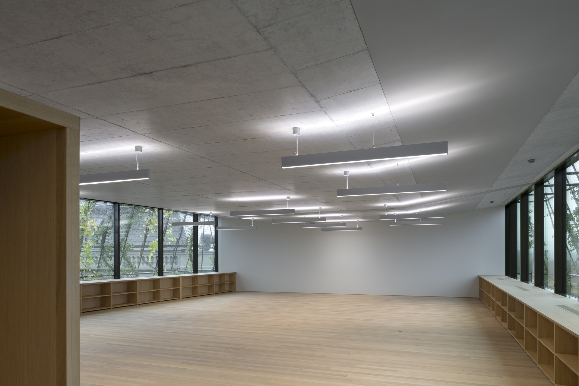 Das etwas ruppige Äußere des Schlössli mit seinem sichtbaren Findlingsmauerwerk war weitgehend intakt und blieb nahezu unverändert erhalten. Der ursprüngliche Gedanke, an den Fassaden der Erweiterung das Motiv des Sichtmauerwerks aufzugreifen, wurde von den Architekten glücklicherweise als zu anbiedernd verworfen, ebenso wie der Einsatz von Holz am verglasten Staffelgeschoss. Hier oben residiert die Museumsverwaltung mit wunderbarem Blick auf Stadt und Landschaft in einem stützenfreien, lichten Raum. Um eine sommerliche Überhitzung zu verhindern, könnte, da bereits baulich vorgesehen, ganz unkompliziert ein Sonnenschutz nachgerüstet werden. Bisher jedoch hat das vorgelagerte begrünte Rankgerüst diese Aufgabe gut bewerkstelligt.