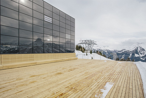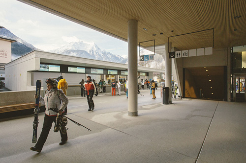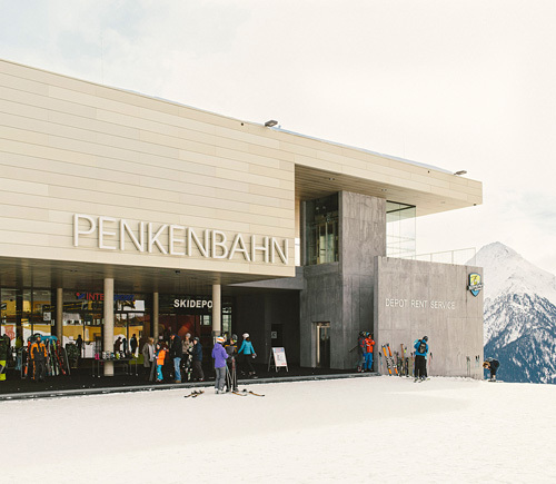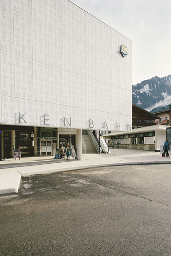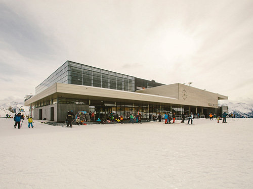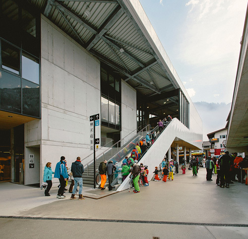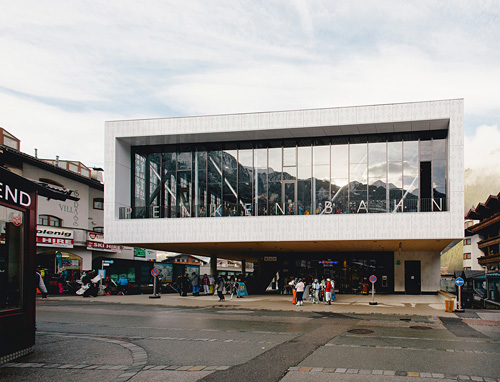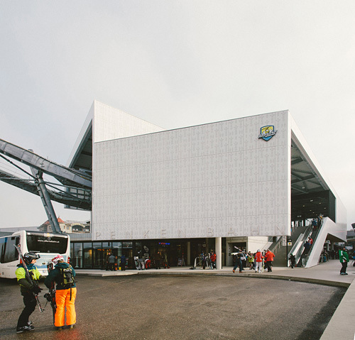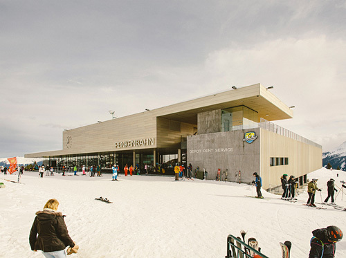 Der Grundidee eines „Bahnhofs“ folgend wurde ein übersichtlicher Verkehrsbau mit guter Orientierung und klarer Wegführung errichtet. Das Gebäude ist horizontal in unterschiedliche, inhaltlich ablesbare Bereiche strukturiert: ein dunkler Sichtbetonsockel mit Garage und Schlosserei, der von kupfernem Trapezlochblech umhüllte Bauteil für Skidepot, Shop und Verleih, darüber ein Sonnendeck. Der Bahnhof mit seiner großen „Bahnhofsuhr“ auf der Vorplatzüberdachung ist mit Photovoltaikelementen umhüllt, die zu einem guten Teil den Stromverbrauch des Bahnbetriebs abdecken. (Text: Claudia Wedekind)