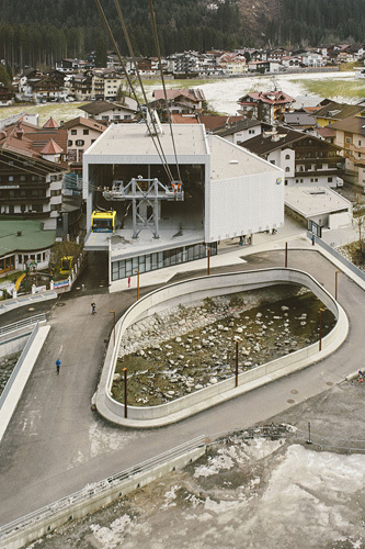 Für den Bau der Talstation wurde ein geladener Realisierungswettbewerb ausgeschrieben, den reitter_architekten mit einem Projekt gewannen, das feinfühlig auf den Ortskern reagiert. Sie bringen die große Kubatur mit ihren weitgehend festgelegten Funktionsabläufen – neben der eigentlichen Seilbahninfrastruktur waren auch großzügige Flächen für den Kassenbereich sowie für einen Shop, einen Skiverleih und Skidepots gefordert – in einem Baukörper unter, der die Staffelung der übrigen Häuser der Straße übernimmt und sich in die bestehenden Fassadenfluchten einreiht. Der Technik im Obergeschoss wurde genau das Volumen gegeben, das gefordert war, die Verkaufsflächen im Erdgeschoss liegen mit Schaufassaden an drei Seiten direkt an den Wegen der Gäste. Der Kassabereich wurde separat im Süden am Ziller positioniert, ein großes Vordach bietet Witterungsschutz, eine abgetreppte Sitzbank bildet die Verbindung zur Dorfstraße.