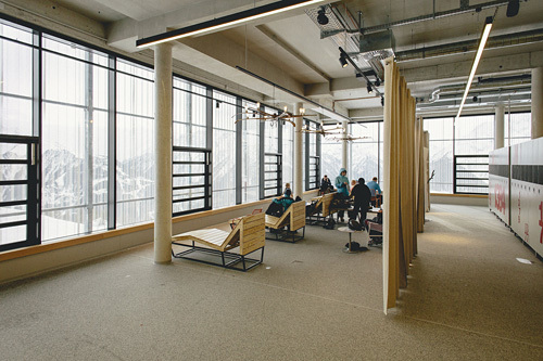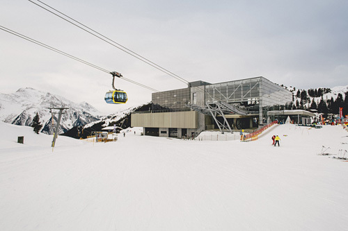 Als Wettbewerbssieger wurden reitter_architekten in Folge auch mit der Planung der Bergstation betraut. Am Berg galt es genauso, ein betriebstechnisch notwendiges großes Volumen in eine sensible Umgebung einzufügen, speziell da die 33 Gondeln hier täglich vom Seil genommen und parkiert werden, was im Tal aufgrund der beengten Verhältnisse nicht möglich ist. Neben der Seilbahnhalle musste in der Bergstation Raum für ein großes Skidepot, einen Shop, eine Werkstätte für die Pistengeräte sowie die notwendigen Betriebsräume zur Verfügung gestellt werden.
